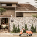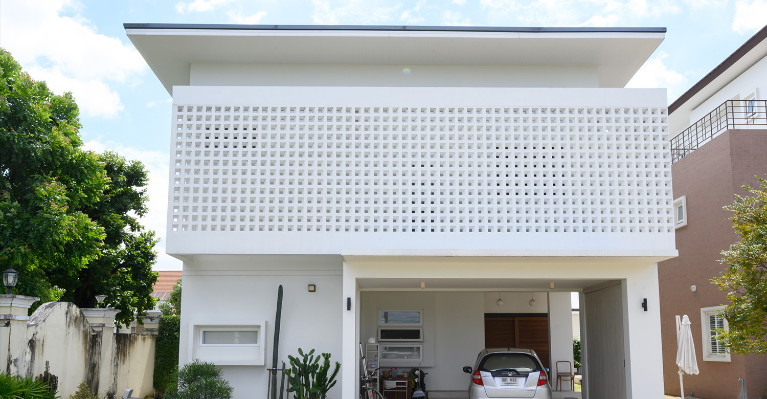 หากมองจากโครงสร้างภายนอก ทำให้เรานึกถึงบ้านสมัยเก่าประมาณยุค 60-70s เป็นแบบบ้านที่มีดีไซน์เป็นเอกลักษณ์ นำบล็อกช่องลมมาเป็นฟาซาดเพื่อใช้บดบังแสงแดด และสร้างความเป็นส่วนตัวให้กับพื้นที่ภายใน โดยคุณเจี๊ยบ-ไกรสิทธิ์ โภคสวัสดิ์ (พี่เขยของคุณตั๊กและคุณอาร์ม) เป็นคนดูแลเรื่องการออกแบบบ้านหลังนี้ให้ทั้งหมด