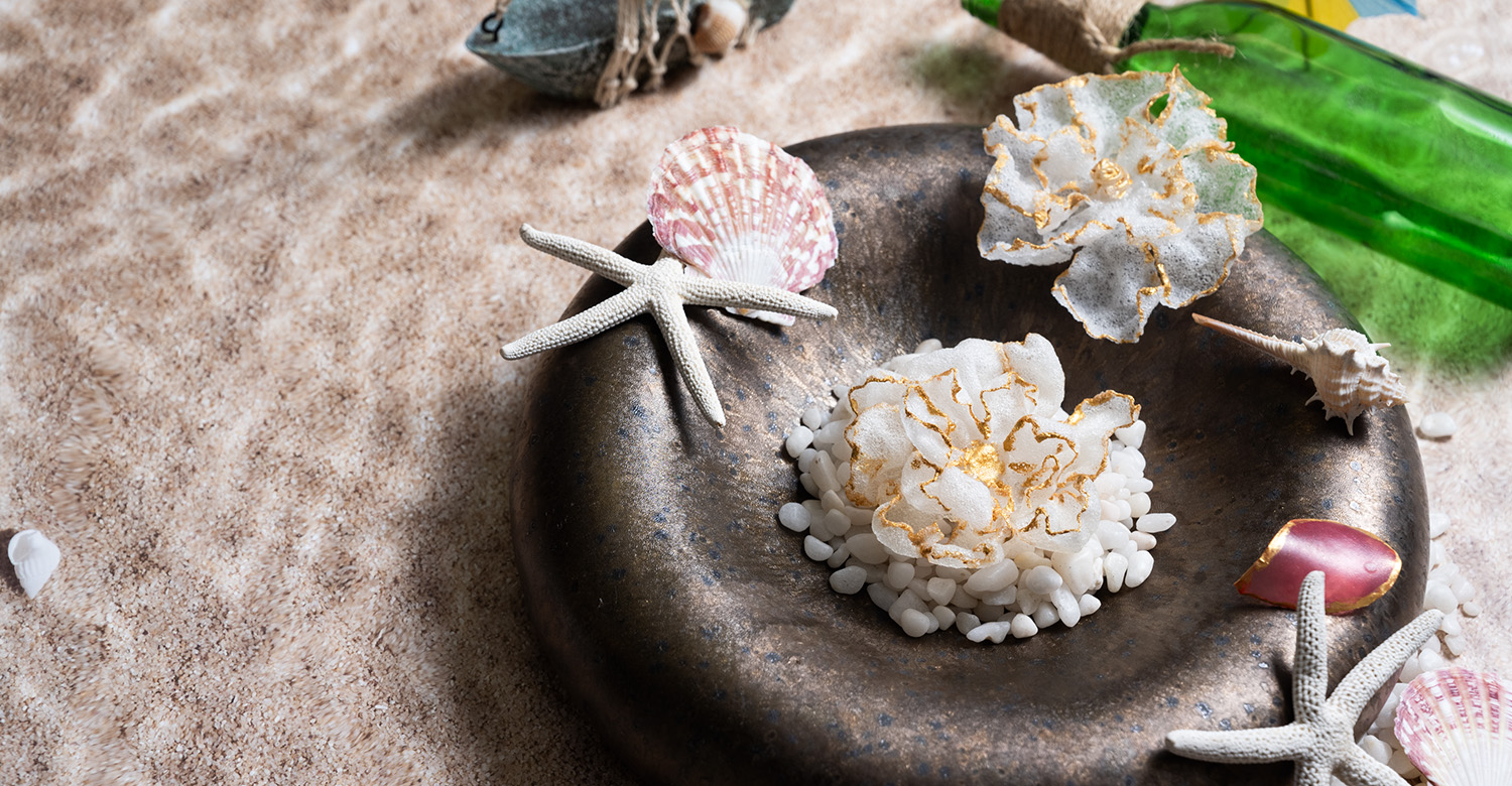 6. ตกแต่งเพิ่มโดยทาปลายกลีบดอกไม้ด้วยผงทอง (Gold Edible Glitter) แบบละเอียดที่นำไปละลายกับน้ำหรือแอลกอฮอล์สีใส (Alcohol Food Grade) วางพักไว้จนแห้งแล้วนำไปตกแต่งจานอาหาร