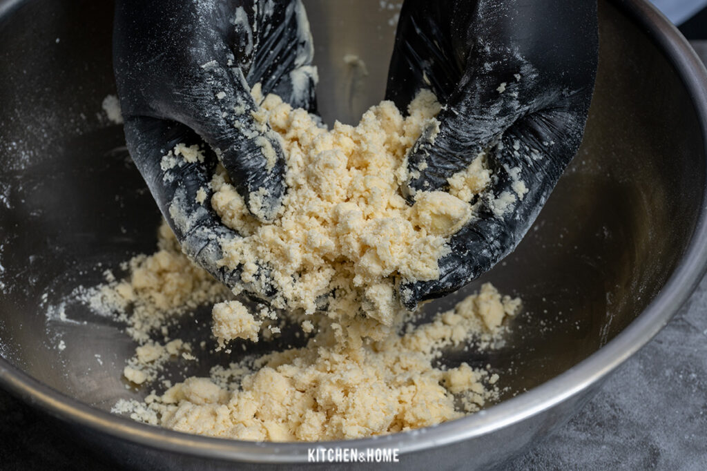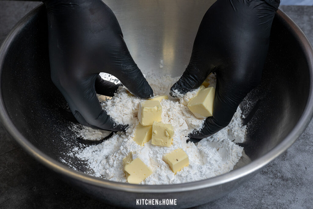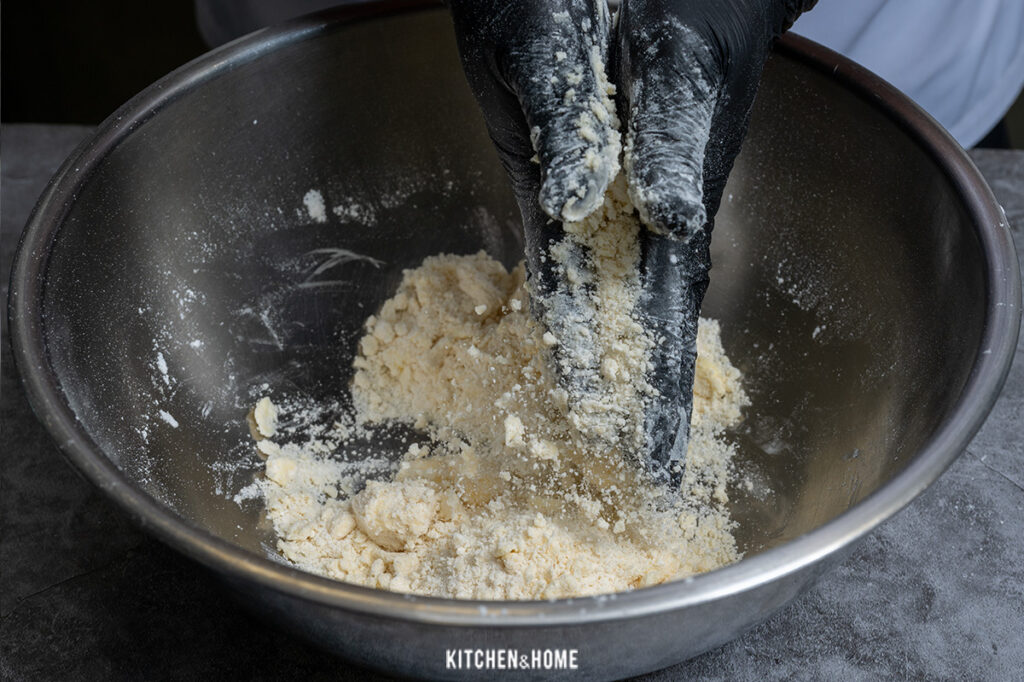 ควรใช้เนยที่แช่เย็นแล้วนำมาตัดเป็นชิ้นเล็กๆ ผสมแป้งโดยค่อยๆ บิให้เนยแตกตัวก่อนแล้วจึงค่อยๆ ถูกับแป้ง