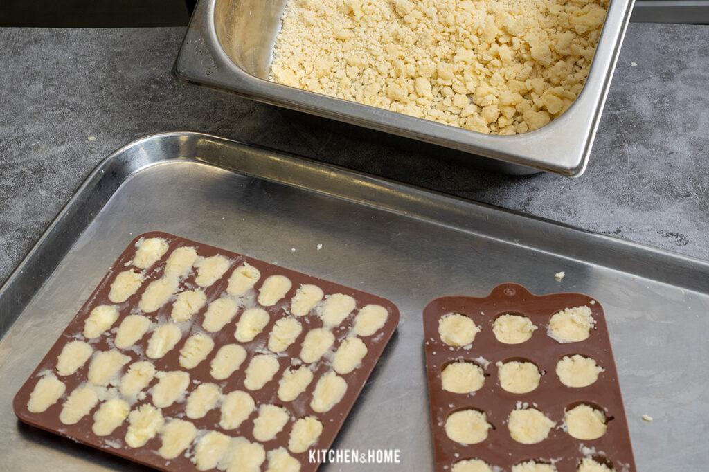 กดแป้งครัมเบิลลงในพิมพ์ที่เตรียมไว้ให้แน่น แล้วนำเข้าเตาอบจนสุก จะมีลักษณะคล้ายกับคุกกี้ ตกแต่งตามชอบ
