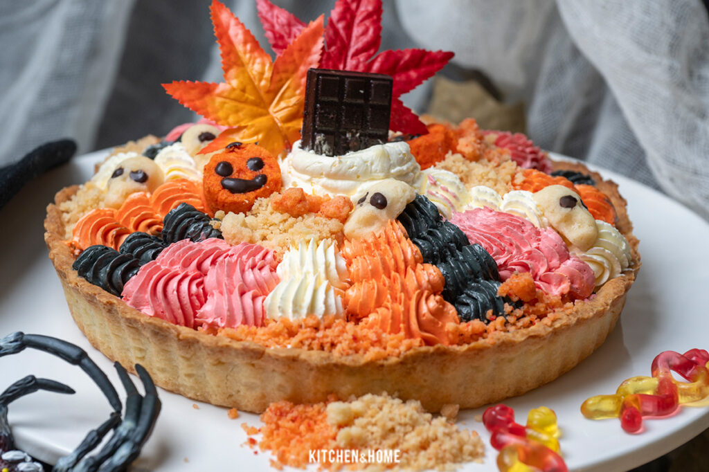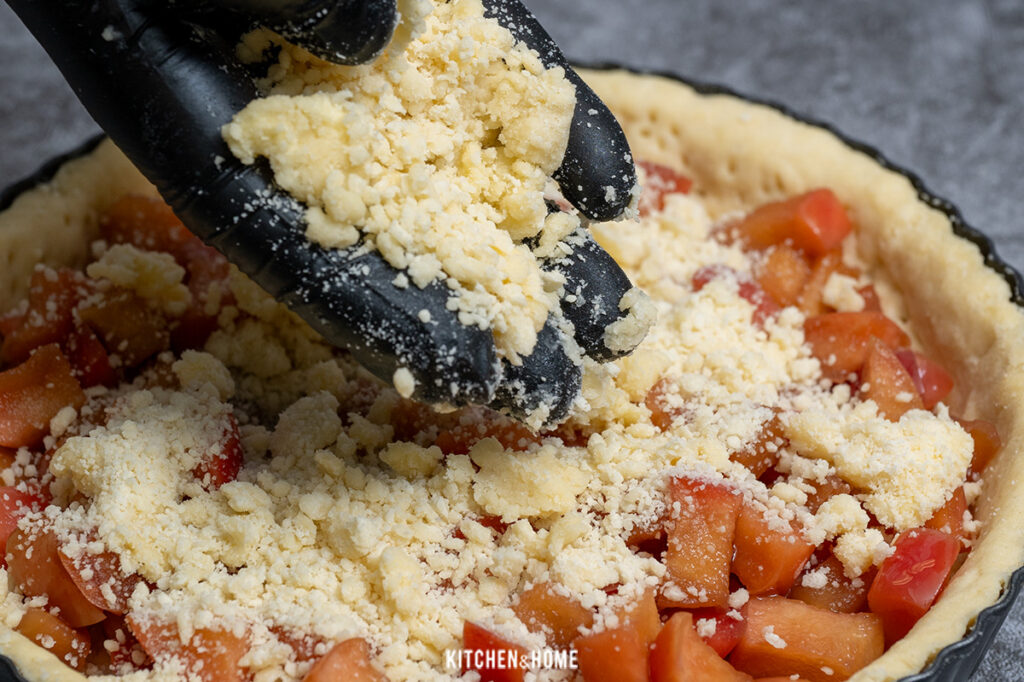 สำหรับ Apple Tart นำแป้งครัมเบิล (ดิบ) โรยบนหน้าให้ทั่ว แล้วนำเข้าเตาอบอุณหภูมิ 180 องศาเซลเซียสจนสุก