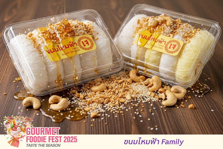 • ขนมไหมฟ้า Family – ขนมมงคลโบราณ ทำจากน้ำผึ้งดึงมือเป็นเส้นบางนับหมื่นเส้น สอดไส้ถั่วและเม็ดมะม่วงหิมพานต์ หอมกรุบกรอบหากินยาก