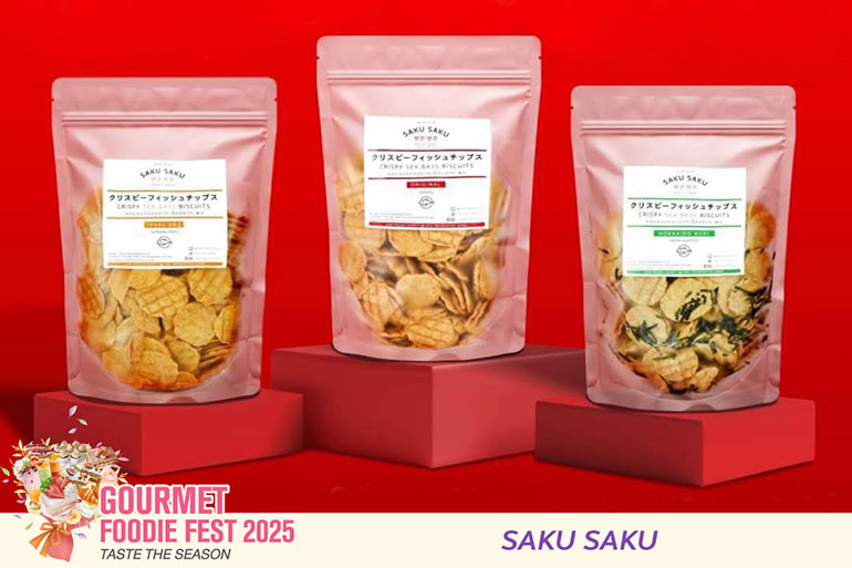 • SAKU SAKU – ขนมอบกรอบจากเนื้อปลากะพง 90% มี 7 รสชาติ ทั้งทรัฟเฟิล หมาล่า ลาบ และต้มยำกุ้ง