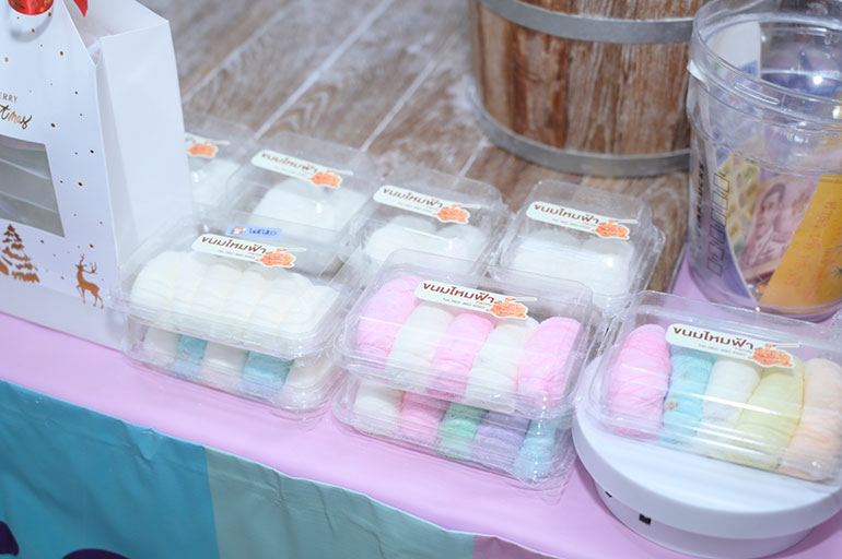• ขนมไหมฟ้า Family ขนมมงคลโบราณ ทำจากน้ำผึ้งดึงมือเป็นเส้นบาง สอดไส้ถั่วและเม็ดมะม่วงหิมพานต์
