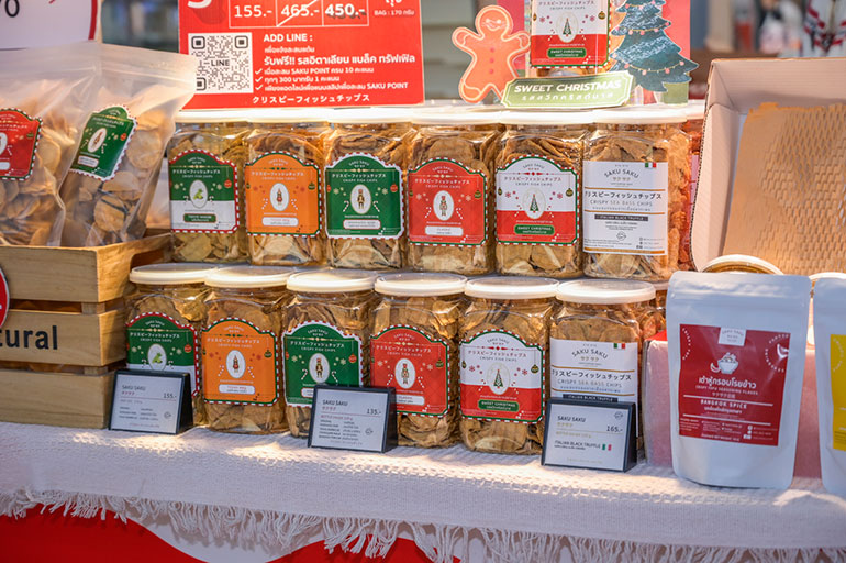 • SAKU SAKU ขนมอบกรอบจากเนื้อปลากะพง 90% มี 7 รสชาติ ทั้งทรัฟเฟิล หมาล่า ลาบ และต้มยำกุ้ง