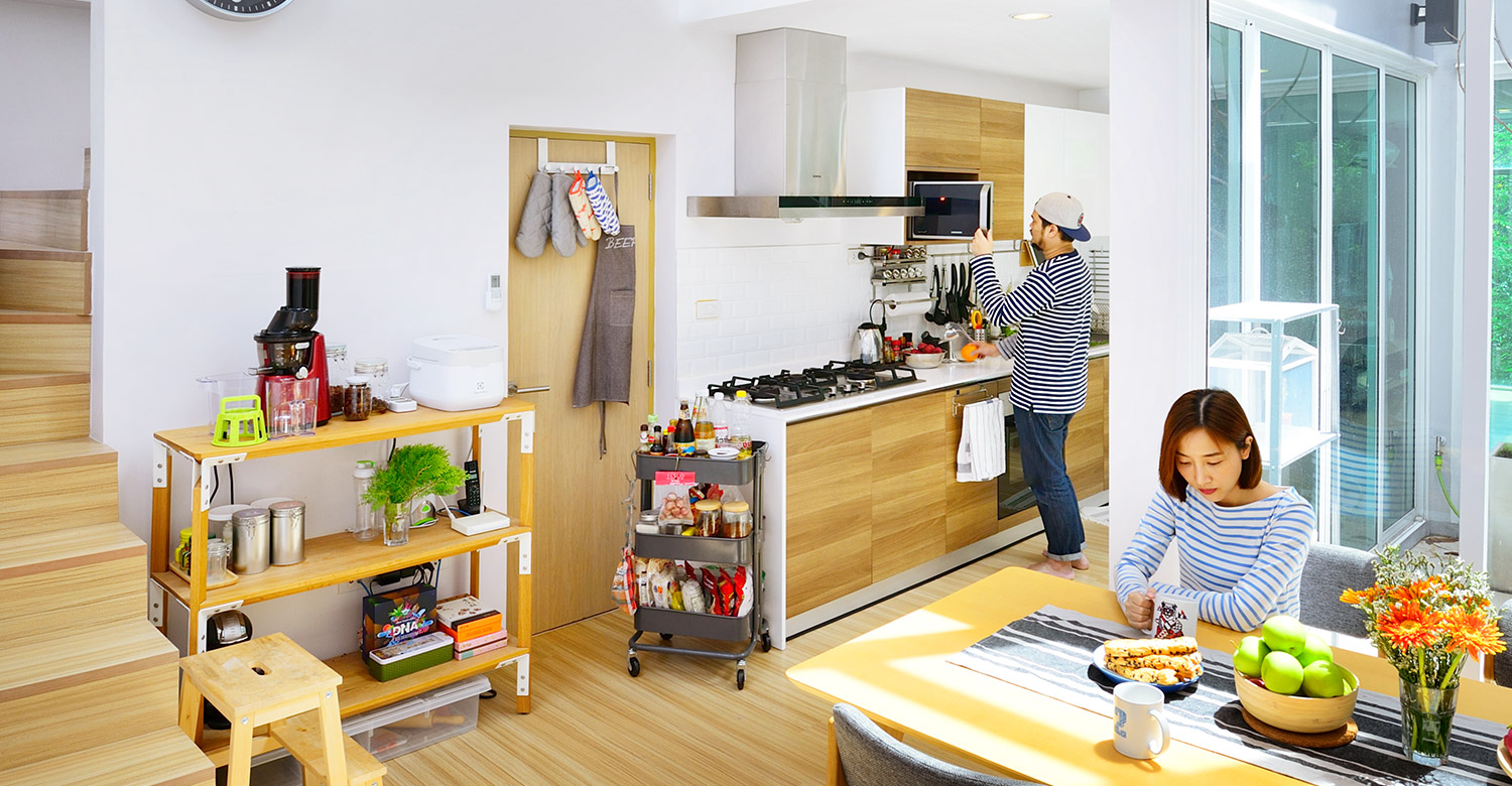 มาถึงตรงนี้คนที่จะบอกเล่าถึงส่วนห้องครัวได้ดีคงจะไม่ใช่คุณกิฟต์อย่างแน่นอน “เบียร์กับพี่กิฟต์ช่วยกันออกแบบห้องครัวคร่าวๆ ว่าอยากได้ประมาณไหน สไตล์ที่เราชอบคือให้ดูมินิมอล สะอาดตา เน้นฟังก์ชันใช้งานเป็นหลัก ซ่อนเตาแก๊สกับถังขยะให้ดูเรียบร้อย โทนสีที่เลือกใช้คือสีขาวสลับกับงานไม้ เป็นชุดครัวของทาง SB แต่เราออกแบบและเลือกวัสดุเองว่าอยากได้แบบไหน หลังจากติดตั้งครัวเสร็จ เราก็ไปซื้ออุปกรณ์สำเร็จมาติดเพิ่มเติม อย่างที่ราวแขวนอุปกรณ์ ที่แขวนผ้า หรือที่วาง iPad ไปซื้อรถเข็นสำหรับใส่ของมาเพิ่ม เพราะพื้นที่ตรงเคาน์เตอร์ไม่พอ ดูน่ารักดี และยังหยิบของใช้ได้สะดวก”