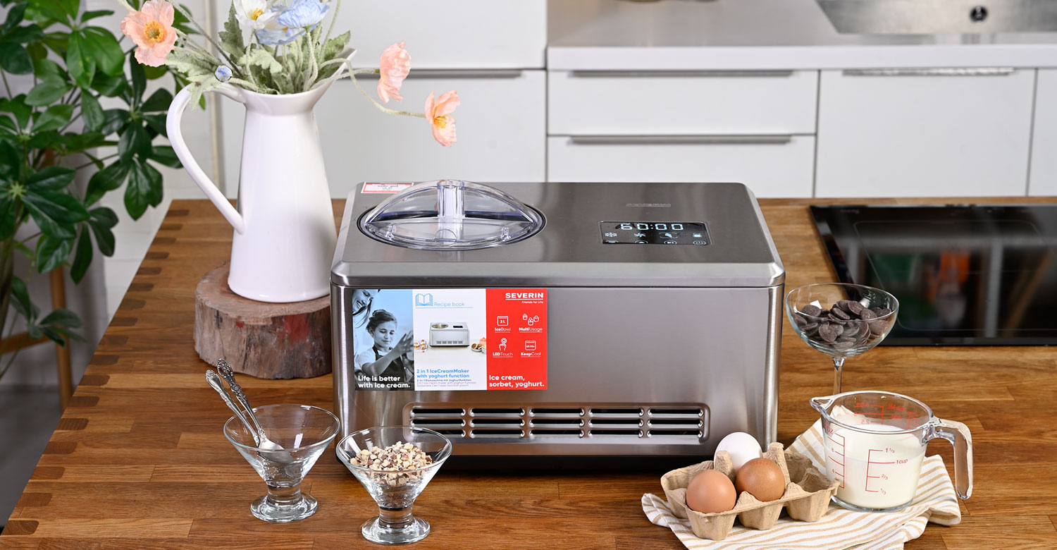 ไม่ต้องรอถึงหน้าร้อนเราก็มีโอกาสได้ลิ้มลองไอศกรีมรสชาติใหม่ๆ ได้ทุกวัน ด้วยเครื่องทำไอศกรีมขนาดเล็ก แบรนด์ SEVERIN จากเยอรมนีเครื่องนี้ สามารถทำไอศกรีมโฮมเมดได้หลากหลายรสชาติ อีกทั้งยังเหมาะกับสายวีแกนทำสูตรไม่ใส่นม เนย ไข่ หรือผลิตภัณฑ์จากสัตว์ใดๆ รวมถึงยังสามารถทำโยเกิร์ตได้อีกด้วย