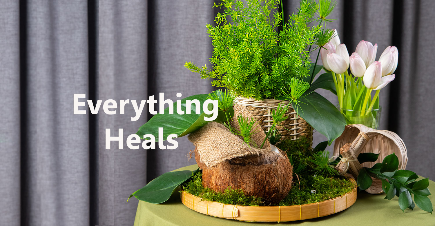 นำกะลามะพร้าวแบบเปิดหัวโชว์เนื้อมะพร้าวด้านในมาจัดวางโดยให้กะลามะพร้าวแทนตัวเองเป็นแจกัน นำผ้ากระสอบมาพันกับกิ่งต้นกกและไม้ใบทรงสวย จับเสียบเข้าไปในกะลาจากนั้นตกแต่งเพิ่มเติมด้วยตะกร้าหวายที่เสียบไม้ทรงพุ่มใบเล็กๆ ให้เป็นช่อสวยงาม ที่เหลือตกแต่งเพิ่มด้วยดอกทิวลิปสีขาวเจือชมพูอ่อนๆ เพื่อให้มีสีสันขึ้นมาสักหน่อย