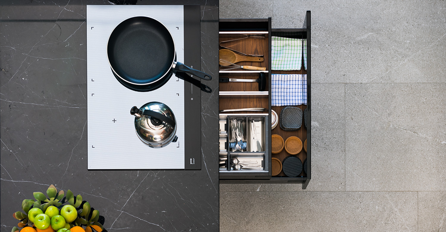 พื้นที่สำหรับจัดเตรียมอาหาร อย่างบริเวณไอส์แลนด์ เพิ่มลิ้นชักจัดเก็บแล้วเลือกอุปกรณ์เสริมด้วยถาดที่แบ่งช่องการใช้งานเป็นหมวดหมู่