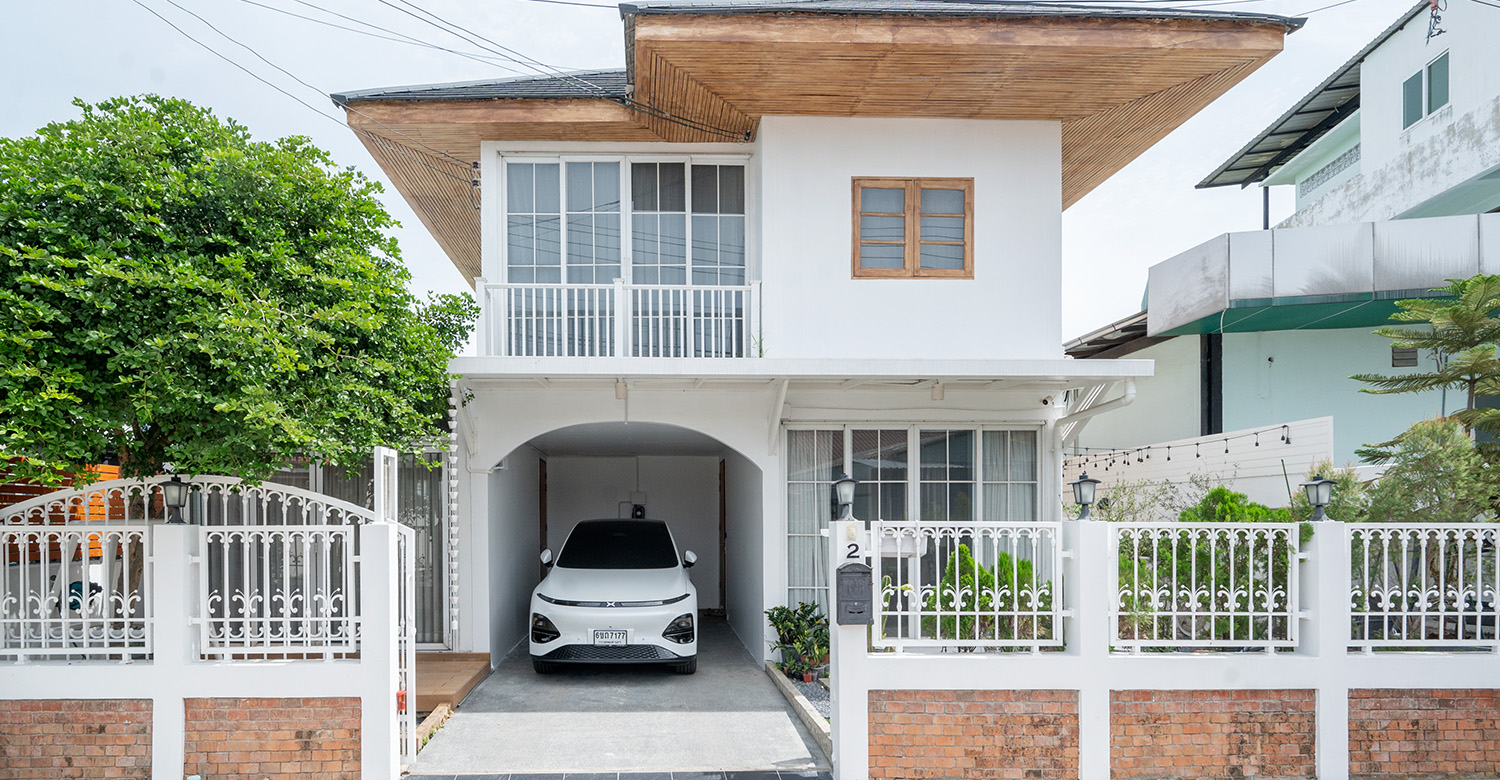 หากมองจากภายนอก บ้านสีขาวสะอาดตาโดดเด่นอยู่หลังแนวรั้วเหล็กดัดลวดลายอ่อนช้อยในโทนสีเดียวกัน ความเขียวขจีของต้นไม้ที่จัดวางอย่างมีจังหวะช่วยเติมชีวิตให้บ้านดูมีมิติ และชวนให้ใครหลายคนอยากก้าวข้ามรั้วเข้ามาสัมผัสบรรยากาศภายใน พื้นที่ที่เต็มไปด้วยเรื่องเล่า กลิ่นอายความทรงจำ และรายละเอียดของดีไซน์ที่มีความเป็นตัวเองอย่างชัดเจน