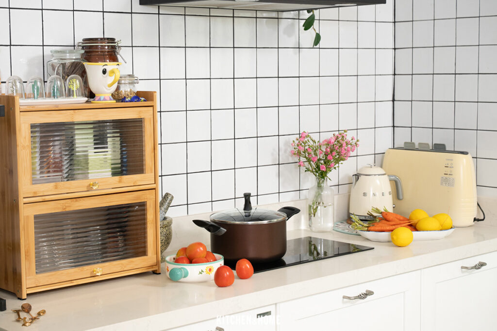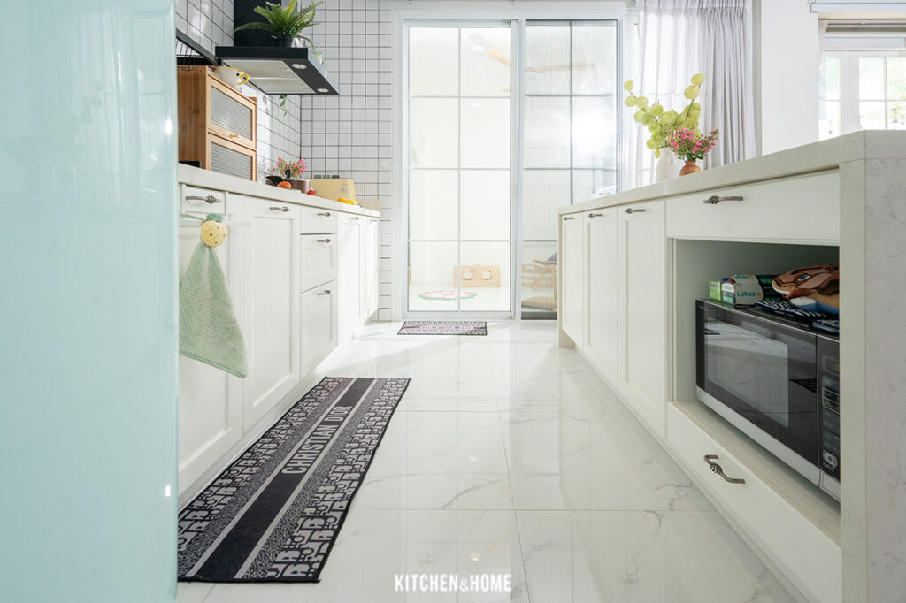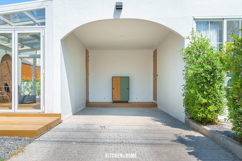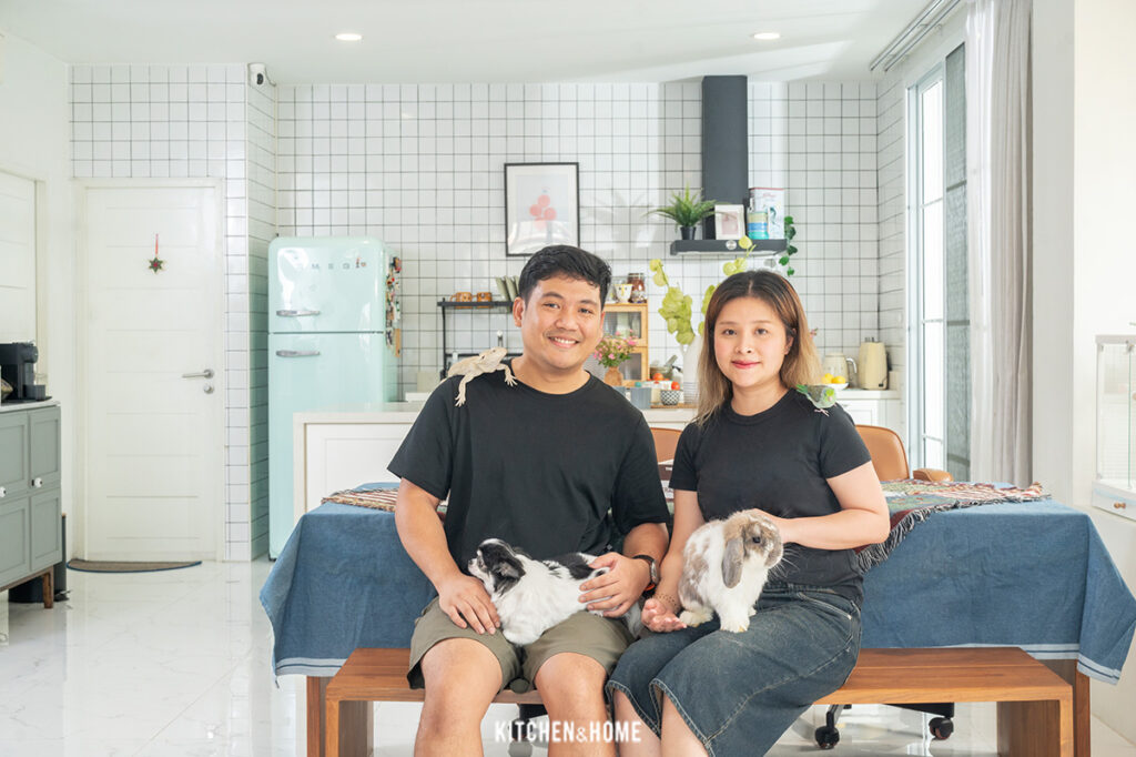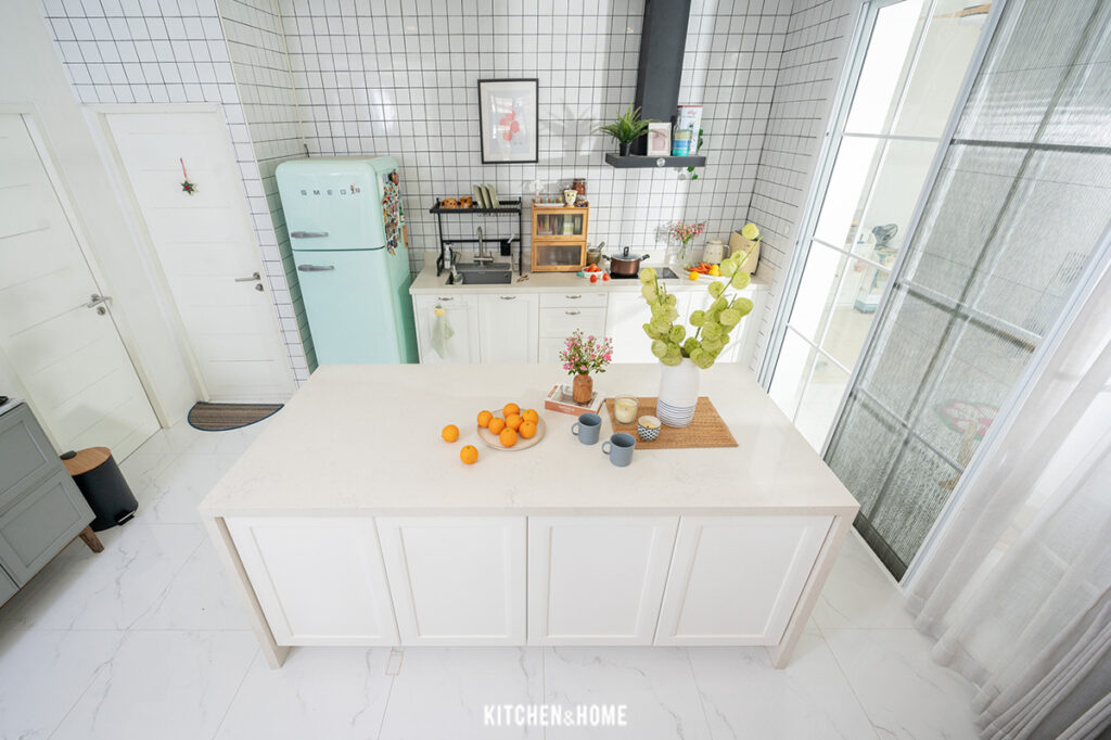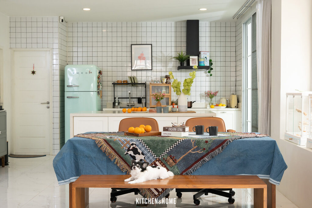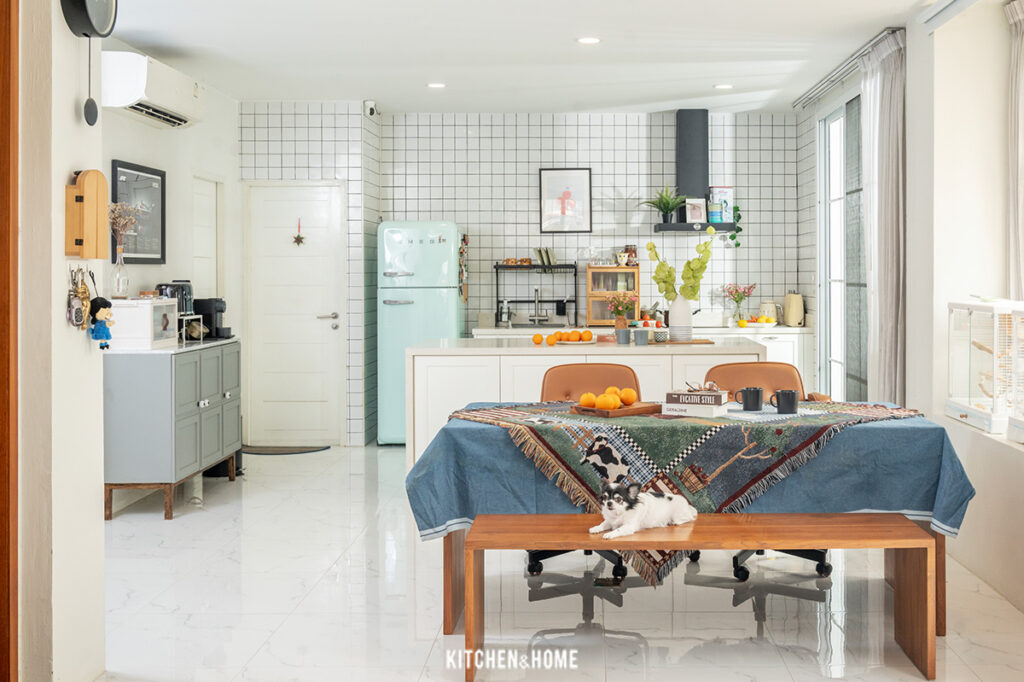 คุณวิล – วิล์ลญา สงค์อิ่ม สถาปนิกผู้ออกแบบบ้านหลังนี้ เล่าถึงความท้าทายตั้งแต่จุดเริ่มต้นของ   โปรเจ็กต์ว่า “โจทย์แรกที่คุณณัฐให้มาคืออยากทำสตูดิโอให้เช่า มีหลายมุมสำหรับถ่ายภาพ ต่อมาก็ปรับเป็นคาเฟ่ที่ต้องการพื้นที่นั่งจิบกาแฟหลายมุม และสุดท้ายโจทย์ถูกเปลี่ยนไปอีกครั้งเป็นบ้านสำหรับอยู่อาศัย ดังนั้นดีไซน์ทั้งหมดต้องยืดหยุ่นและปรับให้ลงตัวกับทุกบริบท”การปรับเปลี่ยนฟังก์ชันอย่างชาญฉลาดนี้ปรากฏให้เห็นอย่างชัดเจน โดยเฉพาะในโซนแพนทรีที่เดิมทีถูกออกแบบให้เป็นเคาน์เตอร์ชงกาแฟสำหรับคาเฟ่ แต่ภายหลังถูกพลิกบทบาทให้กลายเป็นแพนทรีที่กลมกลืนกับครัวในบ้าน ผนังครัวกรุด้วยกระเบื้องเซรามิกสีขาวลายตาราง เพิ่มดีเทลเรียบง่ายแต่มีสไตล์ และตัดด้วยตู้เย็นสีเขียวมินต์คลาสสิกที่กลายเป็นไฮไลต์ชวนสะดุดตา