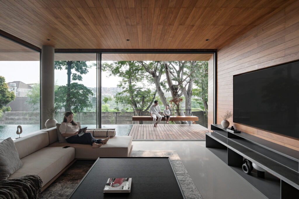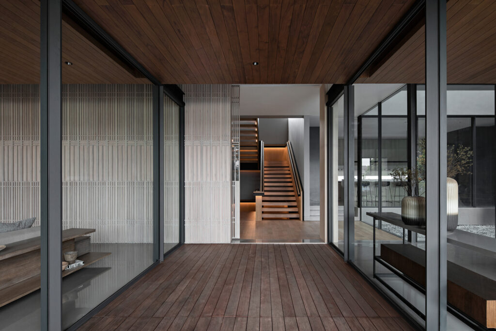 ชั้นแรกของบ้านประกอบไปด้วยห้องนั่งเล่นและห้องทำงาน ซึ่งมีทางเข้าออกที่แยกจากกัน ระดับพื้นของแต่ละชั้นมีความแตกต่างเล็กน้อย เพื่อสร้างมิติทางสายตาและเพิ่มความสูงของเพดานให้เหมาะสมกับแต่ละพื้นที่ นอกจากนี้ ระเบียงไม้ยังช่วยแยกสัดส่วนของห้องต่างๆ และเชื่อมต่อกับสระว่ายน้ำกลางบ้านได้อย่างกลมกลืน