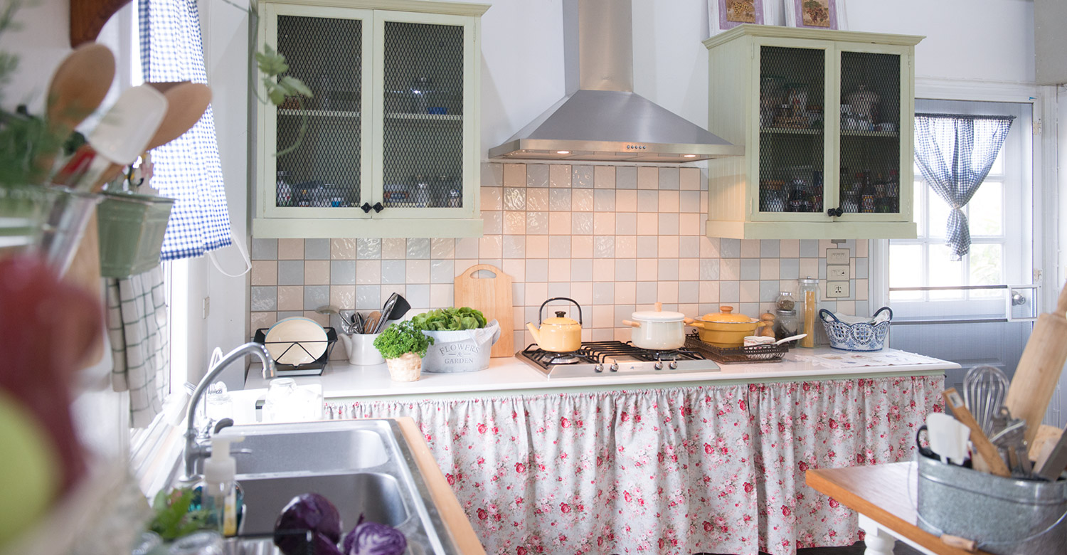 หรือจะนำผ้ามาตัดเย็บเป็นผ้าม่าน เลือกใช้ผ้าที่ไม่หนาจนเกินไป เพื่อให้แสงสว่างสามารถผ่านเข้ามาได้ทำให้ห้องครัวดูโปร่งไม่อึดอัด อากาศถ่ายเทได้สะดวก ตลอดจนการเลือกผ้าสีสันสดใสมีลายดอกไม้มาใช้ตัดเย็บเป็นที่รองจาน ชั้นวางของ ผ้าปูโต๊ะ ผ้าคลุมตู้เย็นหรือเครื่องใช้ไฟฟ้าก็ดูน่ารักและทำให้ห้องครัวสดใสมีชีวิตชีวาเหมือนกันนะคะ แต่ถ้าใครยังนึกภาพไม่ออกเรารวบรวมไอเดียมาฝาก ตามไปดูกันเลย