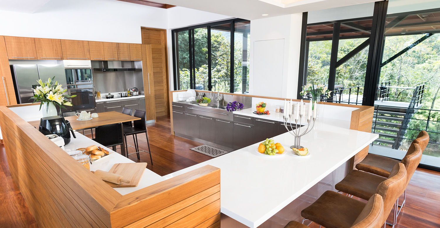 ควรดูว่าเคาน์เตอร์ชุดครัวใช้แบบใดเช่น หินแกรนิต หินสังเคราะห์ ไม้ หรือจะเชื่อมเป็นชิ้นเดียวกันกับทอปเพื่อลดรอยต่อและลดปัญหาการผุพังของพื้นผิวที่ก่อให้เกิดการสะสมของคราบสกปรก