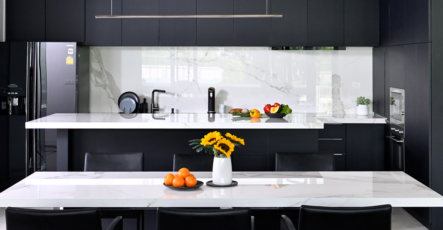 อย่างการเปลี่ยนสีของหน้าบานชุดครัวจากเดิมที่เป็นลายไม้สีน้ำตาลอ่อน ถูกกำหนดโทนสีใหม่ให้เป็นสีดำแล้วขยายขนาดของตู้แขวนจรดฝ้า เพื่อรองรับการเก็บของที่มากขึ้น หรือแม้แต่การนำหิน Sintered Stone มาตกแต่งบริเวณ Backsplash ลิงค์กันกับทอปเคาน์เตอร์ครัว เพื่อให้ดีไซน์ทั้งหมดดูสอดคล้องกันอย่างสวยงาม และเมื่อหน้าบานชุดครัวสีดำผิวแมทช์เมื่อนำมาอยู่ร่วมกับหินสีขาวลวดลายคล้ายหินอ่อนผิวกลอสยิ่งขับให้ครัวดูโดดเด่นมากขึ้น