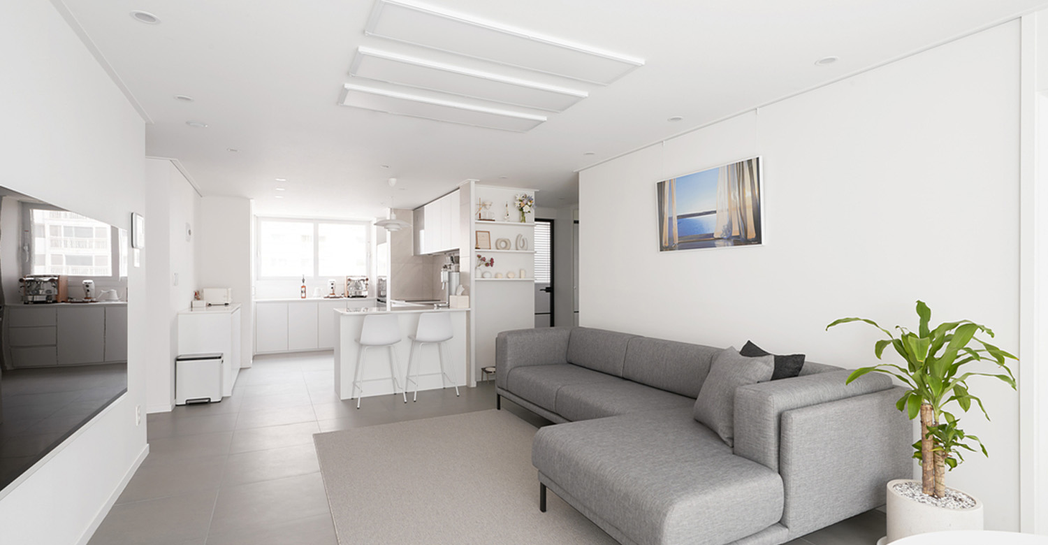 ลองมาดูมุมกว้างกันอีกซักมุม จะเห็นว่าห้องนั่งเล่นเชื่อมต่อกับห้องครัว เลือกใช้สีทูโทนระหว่างสีขาวและเทาแบบไล่เฉดตั้งแต่อ่อนจนถึงเข้ม ทำให้บรรยากาศบริเวณนี้มีความผ่อนคลาย