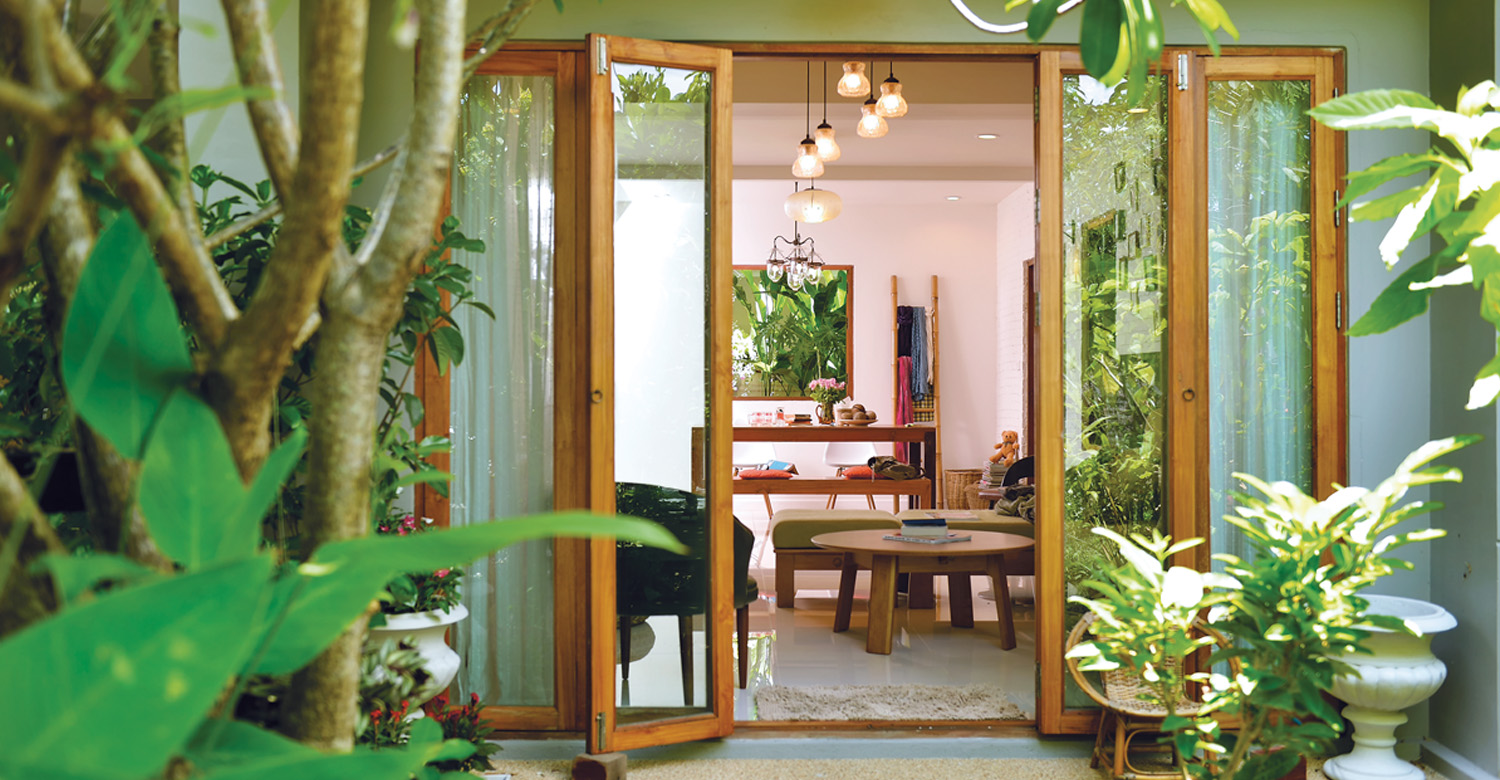 ตัวอย่างของการตกแต่งบ้านหลังนี้ไม่เพียงเลือกใช้วัสดุและเฟอร์นิเจอร์ที่เรียบง่ายเท่านั้นแต่ยังดึงเอา บรรยากาศธรรมชาติที่เป็นสวนหย่อมภายนอกเข้ามาสู่พื้นที่ภายในบ้านได้อย่างพอดิบพอดี ช่วยสร้างบรรยากาศให้ดูสดชื่น ร่มเย็น สบายตาได้ไม่น้อยเลยทีเดียว