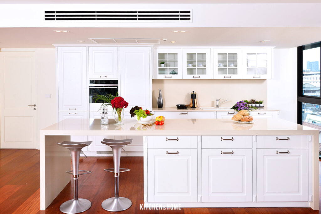 แทนที่จะใช้ตู้ครัวขนาดเล็ก การติดตั้งตู้บิลท์อินสูงถึงเพดาน จะช่วยเก็บของได้มากขึ้น ลดความรก และทำให้สายตารับรู้ว่าพื้นที่ครัวดูสูงโปร่งกว่าเดิม