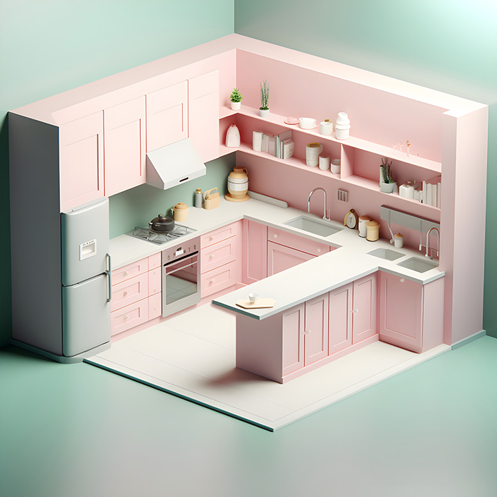 - ครัวรูปตัว L (L-Shaped Kitchen) : จัดตู้เย็น – อ่างล้าง – เตาไฟให้อยู่ตามแนวตัว L สร้างสามเหลี่ยมเล็กๆ ที่เคลื่อนไหวสะดวก