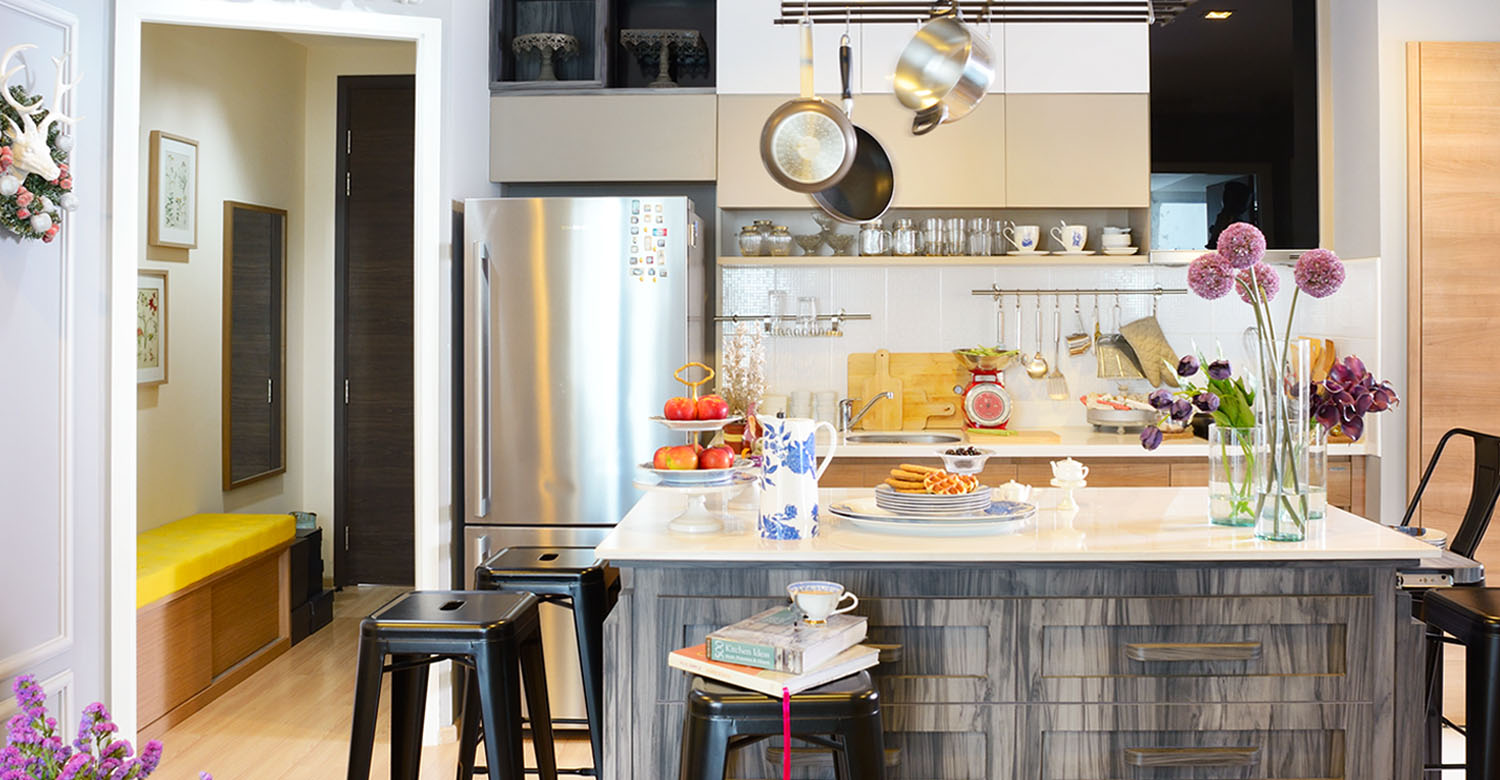 ตัวอย่างการออกแบบครัวในคอนโดที่มีการีโนเวทขึ้นใหม่ให้ตอบโจทย์การใช้งานที่มากขึ้น ถึงจะเป็นครัวขนาดเล็กแต่ก็มีทั้งตู้เก็บของ พื้นที่ส่วนปรุง ส่วนล้าง เพิ่มไอส์แลนด์ไว้ตรงกลางให้ใช้งานได้เอนกประสงค์ ทางด้านขวาสามารถดึงทอปออกมาเป็นโต๊ะกินข้าว ช่วยประหยัดเนื้อที่