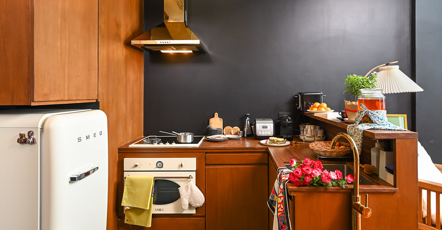 ครัวคอนโดฯ ขนาด 4 ตารางเมตรของคุณมุก-ปิยะกานต์ ออกแบบเคาน์เตอร์ครัวเป็นรูปตัว L บิลต์อินเครื่องใช้ไฟฟ้าเท่าที่จำเป็นและใช้งานจริงๆ เข้ากับชุดครัวให้ดูเรียบร้อย ประหยัดเนื้อที่ และใช้งานได้สะดวก โดยเลือกอุปกรณ์และของใช้ในครัวจากดีไซน์ที่ชอบมามิกซ์แอนด์แมตช์เข้าด้วยกัน ด้านหลังออกแบบเป็นตู้สูงจรดเพดานเพื่อเพิ่มพื้นที่จัดเก็บและเว้นช่องไว้สำหรับจัดวางตู้เย็นขนาดเล็ก เพิ่มกิมมิกด้วยเครื่องดูดควันและก๊อกน้ำสีทองสวยงามลงตัวสุดๆ