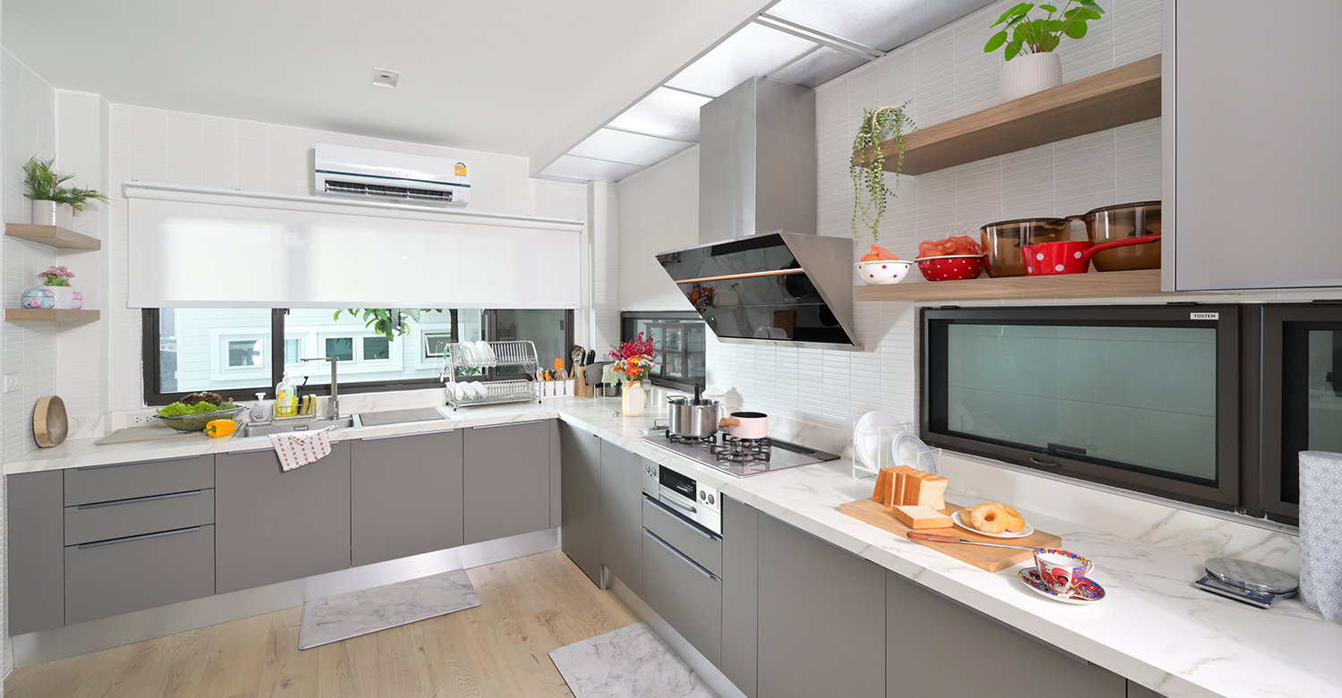 “โทนสีตอนแรกเราจะเลือกให้คล้ายกับครัวในห้องทานข้าว พอเลือกไปเลือกมาก็รู้สึกว่าสีเทาสวยดีแต่เรายังกังวลว่าครัวจะมืดหรือเปล่า แต่ทางสถาปนิกบอกว่าออกแบบห้องให้ค่อนข้างสว่างแล้วไม่ต้องกลัวว่าจะมืดแบบห้องครัวเก่า มู้ดแอนด์โทนก็ยังเข้ากับภาพรวมของบ้าน พลอยจึงตัดสินใจเลือกหน้าบานสีเทา ดูแลทำความสะอาดง่าย และช่วยให้บรรยากาศในครัวดูไม่ขาวโพลน อย่างกระเบื้องผนังพลอยก็เลือกเอง ถึงจะเป็นสีขาวแต่อยากให้ดูมีลูกเล่น ไม่เรียบจนเกินไป”