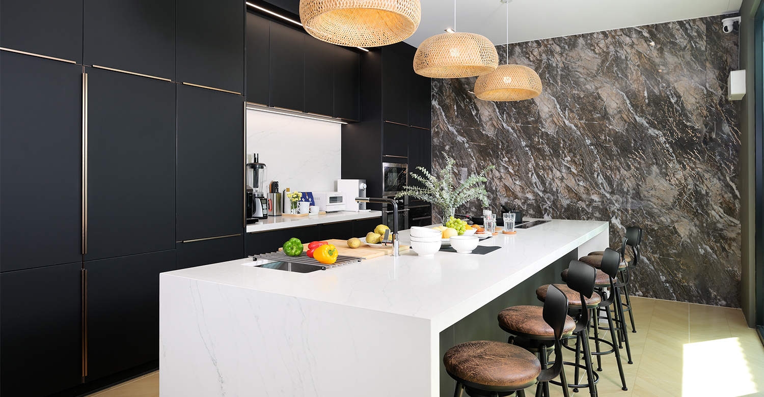 “โดยปกติถ้าเป็นครัวสีดำจะเกิดคราบเด่นชัดและเป็นรอยง่าย แต่ทาง Starmark มีแมตทีเรียลให้เราเลือกค่อนข้างหลากหลาย อย่างวัสดุปิดผิวหน้าบานชุดครัวนี้ก็ตอบโจทย์เราทั้งโทนสีและผิวสัมผัส มีความดำด้านมองแล้วสบายตาไม่เกิดเงาสะท้อน ดูแลรักษาทำความสะอาดง่าย มือจับเราพยายามเลือกแบบให้กลมกลืนกับชุดครัว แต่ยังดูมีลูกเล่น ไม่เรียบจนเกินไป ส่วนทอปไอส์แลนด์เลือกเป็นหินควอตซ์แบบฟู้ดเกรด เราทำอาหารกันค่อนข้างจริงจัง มีทำขนมทำเบเกอรี่ด้วย ทาง Starmark เลยช่วยแนะนำว่าหินควอตซ์เหมาะกับการใช้งานของเรา สามารถทำขนมนวดแป้งบนทอปเคาน์เตอร์ได้เลย แข็งแรงทนทาน ทนความร้อน รอยขีดข่วนต่างๆ ไม่ซึมน้ำ เรียกได้ว่ามีคุณสมบัติตอบโจทย์การใช้งานของเรา” คุณเติ้งอธิบายเพิ่มเติม