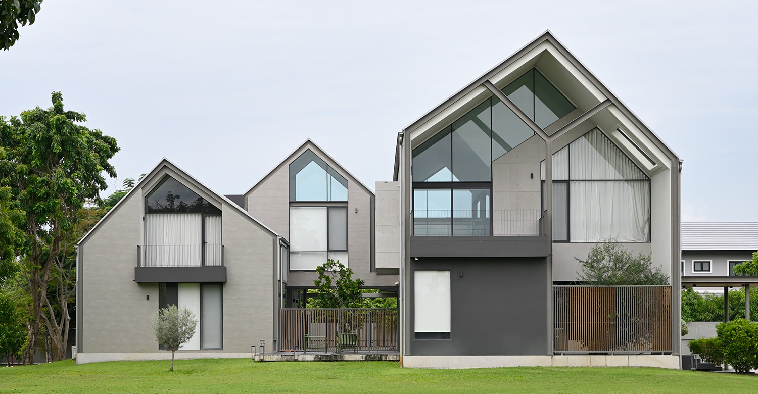 ตัวบ้านภายนอกออกแบบเป็นสไตล์นอร์ดิก โดดเด่นด้วยเส้นสายที่มองแล้วสวยงาม เรียบง่าย สะอาดตา เลือกใช้หน้าต่างและกระจกบานใหญ่เพื่อให้แสงสว่างส่องเข้ามาในบ้านได้อย่างเต็มที่ ขณะเดียวกันก็สามารถมองเห็นวิวทิวทัศน์ภายนอกได้ด้วย “จริงๆ ถ้ามองจากด้านนอก บ้านเราจะเป็นสไตล์นอร์ดิก แต่ถ้าเข้ามาด้านในจะเห็นว่าเราไม่ได้เจาะจงว่าต้องเป็นสไตล์ไหน เราเลือกจากสิ่งที่ชอบมากกว่า เน้นอะไรที่ดูเรียบๆ อยู่ได้นาน ดูแลทำความสะอาดง่าย ส่วนที่เลือกใช้กระจกค่อนข้างเยอะเพราะเราชอบแสงธรรมชาติ ถ้าถามว่ากังวลเรื่องความร้อนไหม เราติดม่านกับฟิล์มกันความร้อน ถึงจะไม่ช่วย 100% แต่ก็ยังช่วยลดความร้อนให้บ้านได้ประมาณหนึ่ง”