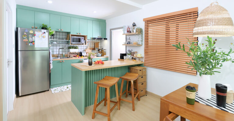 “ช่างที่เราเลือกมาเขาเป็นคนทำงานเรียบร้อยแต่ไม่ถนัดออกแบบ เราก็โอเคไม่เป็นไรเพราะเราออกแบบเองอยู่แล้ว อย่างดีไซน์หรือวัสดุหน้าบานต่างๆ ก็เลือกเอง ถึงแม้ว่าเราจะคุมโทนบ้านเป็นสีขาวกับงานไม้แต่ก็ไม่ได้เป็นขาวล้วนทั้งหมด จะมีลูกเล่นเป็นเท็กซ์เจอร์ลายไม้บ้าง ส่วนฟังก์ชันใช้งานเราก็นำประสบการณ์จากบ้านเก่ามาปรับใช้ เช่น เลือกซิงก์ที่มีขนาดใหญ่ อย่างบ้านเก่าพอซิงก์เล็กวางอะไรก็เต็ม ใช้งานไม่ถนัด ต้องหยิบจานชามมาวางไว้ข้างบนก่อน แต่นี่สามารถทำทุกอย่างได้ในซิงก์เลย ส่วนตู้แขวนด้านบนที่ปกติมักจะทำเป็นหน้าบานหลอกเราก็ออกแบบให้ใส่ของได้จริง ไว้เก็บของที่ไม่ค่อยได้ใช้งาน เช่น เครื่องปั่นอาหารของลูกสมัยเป็นทารก ชุดจานชามที่ยังไม่ได้ใช้ ใต้เคาน์เตอร์ก็ออกแบบให้มีลิ้นชักและช่องสำหรับใส่ของเพื่อเพิ่มพื้นที่จัดเก็บในครัว”
