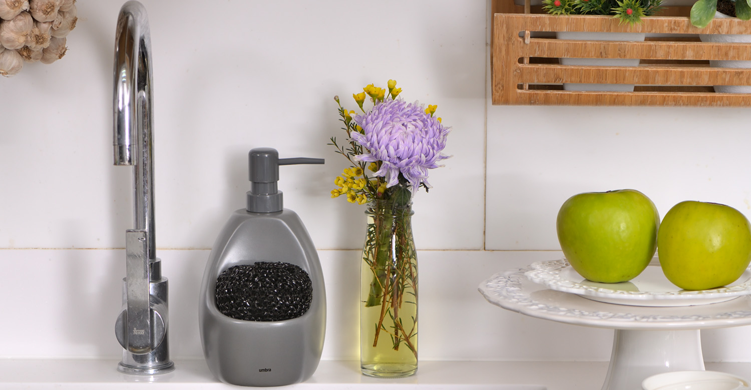 มาเพิ่มไอเทมเก๋ๆ ให้กับห้องครัวด้วยอุปกรณ์ทำความสะอาดที่ดูมีสไตล์อย่างที่ขวดใส่น้ำยาล้างจานพร้อมฟองน้ำ รุ่น Joey Soap Pump And Scrubby จากแบรนด์ Umbra