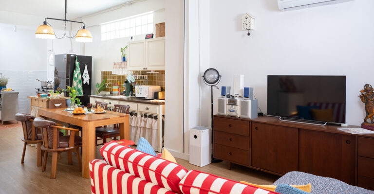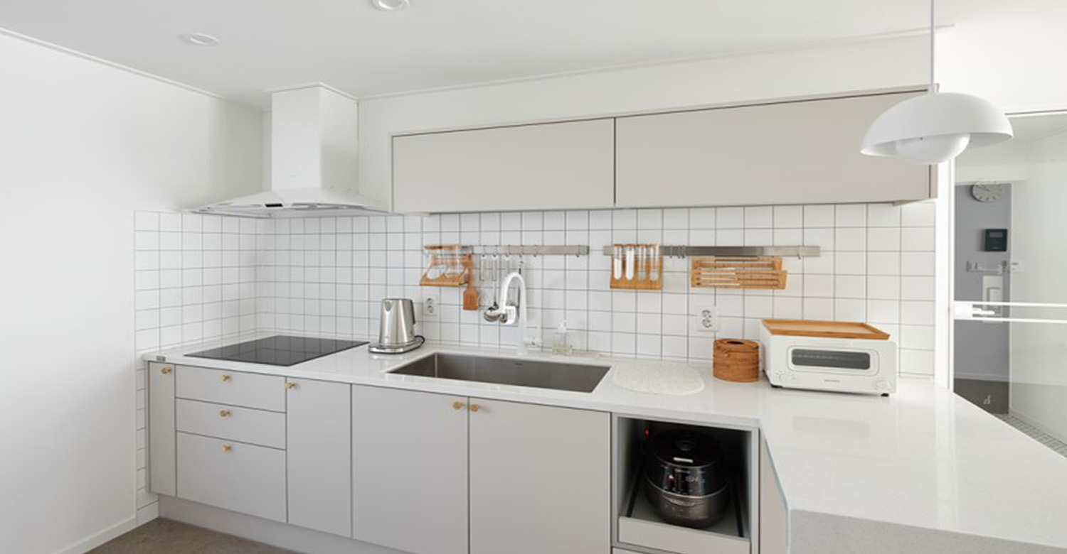 ผนังกระเบื้องสีเหลี่ยมสีขาวแบบนี้ให้กลิ่นอายความเป็นครัวแนวเกาหลีมาก พอติดอุปกรณ์ราวแขวนเข้าไปยิ่งดูละมุนเข้าไปอีก ที่สำคัญคือหยิบของใช้สะดวกมาก เนื่องจากเครื่องใช้ในครัวตรงนี้ใช้งานค่อนข้างบ่อย ไม่ต้องเก็บไว้ในลิ้นชัก แถมโชว์เพื่อความสวยงามได้ด้วย
