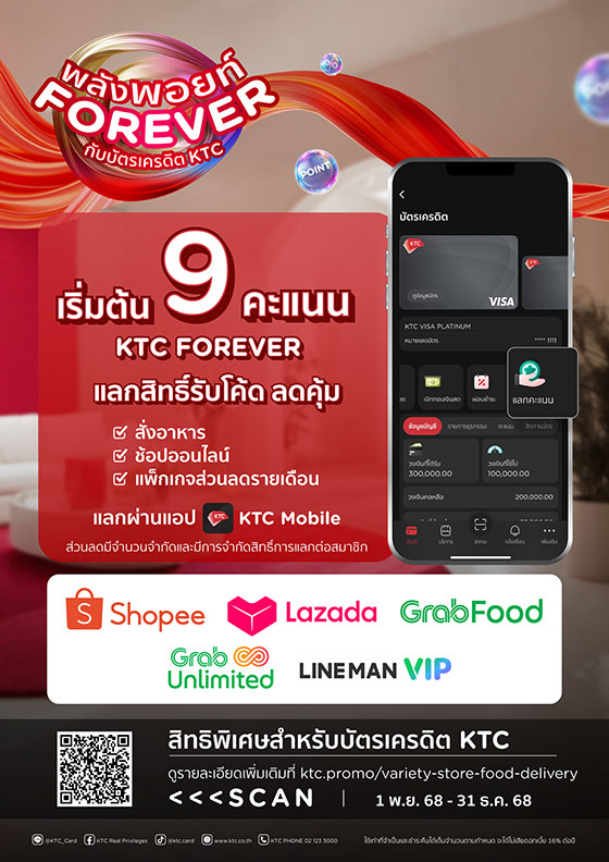 “เคทีซี” หรือ บริษัท บัตรกรุงไทย จำกัด (มหาชน) ร่วมกับแพลตฟอร์มออนไลน์ชั้นนำ Shopee, Lazada, Grab และ LINE MAN ในแคมเปญ “พลังพอยท์ FOREVER แลกไม่หยุด คุ้มสุดทุกดีล” เปิดให้สมาชิกบัตรเครดิตเคทีซีใช้คะแนน KTC FOREVER แลกสิทธิ์รับโค้ดพิเศษ เริ่มต้นเพียง 9 คะแนน ผ่านแอปฯ KTC Mobile สะท้อนกลยุทธ์บริหารความสัมพันธ์ลูกค้า (CRM) ที่มุ่งเพิ่มมูลค่าจากฐานสมาชิกเดิม พร้อมเสริม Loyalty Ecosystem ผ่านการใช้ดิจิทัลแพลตฟอร์มอย่างมีประสิทธิภาพ