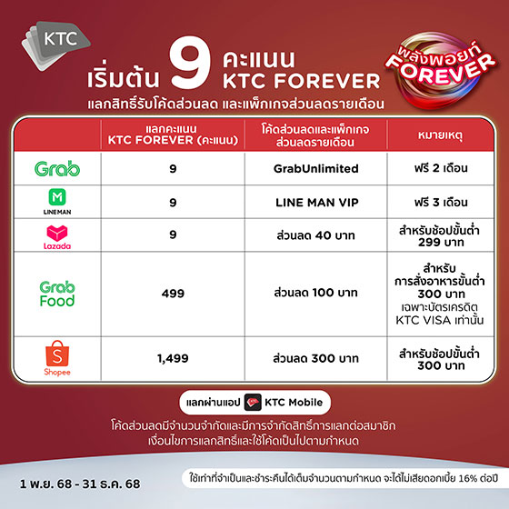 สมาชิกเคทีซีสามารถใช้คะแนนแลกรับสิทธิพิเศษต่างๆ ทั้งการสั่งอาหาร ช้อปปิ้งออนไลน์ และการใช้แพ็กเกจรายเดือน ระหว่างวันที่ 1 พฤศจิกายน 2568 – 31 ธันวาคม 2568 หรือจนกว่าสิทธิ์จะครบจำนวน โดยมีการจำกัดสิทธิ์ในการแลก และเงื่อนไขภายใต้ที่บริษัทกำหนด ทั้งนี้สามารถใช้คะแนนในการแลกสิทธิ์รับโค้ดส่วนลด ดังนี้