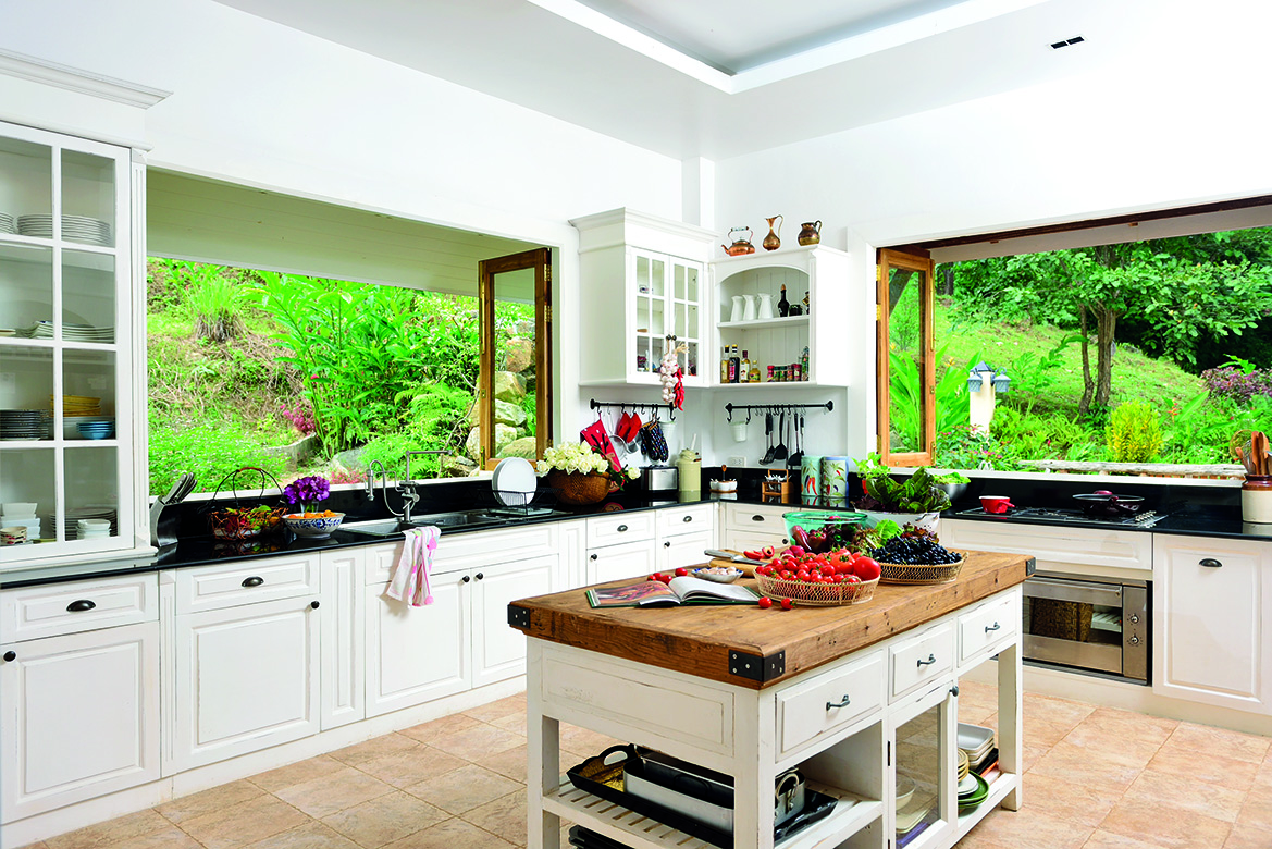 4.ครัวสีขาวสไตล์วินเทจวางแปลนครัวรูปตัวแอลด้วยการใช้ผนังสองด้านคุ้มค่ามากๆ มีตู้แขวนไว้เก็บของได้จำนวนมาก ทั้งหน้าบานแบบทึบและกระจกทำให้ชุดครัวดูไม่ทึบเกินไป กำหนดตำแหน่งส่วนเตรียม ส่วนล้างให้อยู่ต่อเนื่องกัน รวมถึงการเพิ่มไอส์แลนด์ไว้กลางห้องครัวสำหรับติดตั้งเตาไฟฟ้าและทำเป็นมุมทานอาหารมื้อง่ายๆ