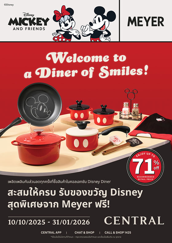 .ร่วมสัมผัสความน่ารัก สดใส และเป็นเจ้าของเครื่องครัวสุดคิวต์ได้แล้ววันนี้ – 31 มกราคม 2569 ที่ห้างเซ็นทรัลทุกสาขา (ยกเว้นสาขาสมุย และป่าตอง) เพียงช้อปสินค้า MEYER Disney Mickey and Friends Collection รับส่วนลดสูงสุดถึง 71% พร้อมสะสมการช้อปสินค้าลงในสมุดสะสม Mickey & Friends Collection ครบตามกำหนด รับของพรีเมียม Meyer Disney เพิ่ม! มูลค่าสูงสุดถึง 4,990 บาท ติดตามรายละเอียดเพิ่มเติมได้ที่ @Meyer Cookware และ @CentralDepartmentStore สอบถามรายละเอียดเพิ่มเติม ณ จุดขาย หรือ จุดแคชเชียร์ ในห้างเซ็นทรัลทุกสาขา *เงื่อนไขเป็นไปตามที่บริษัทฯ กำหนด