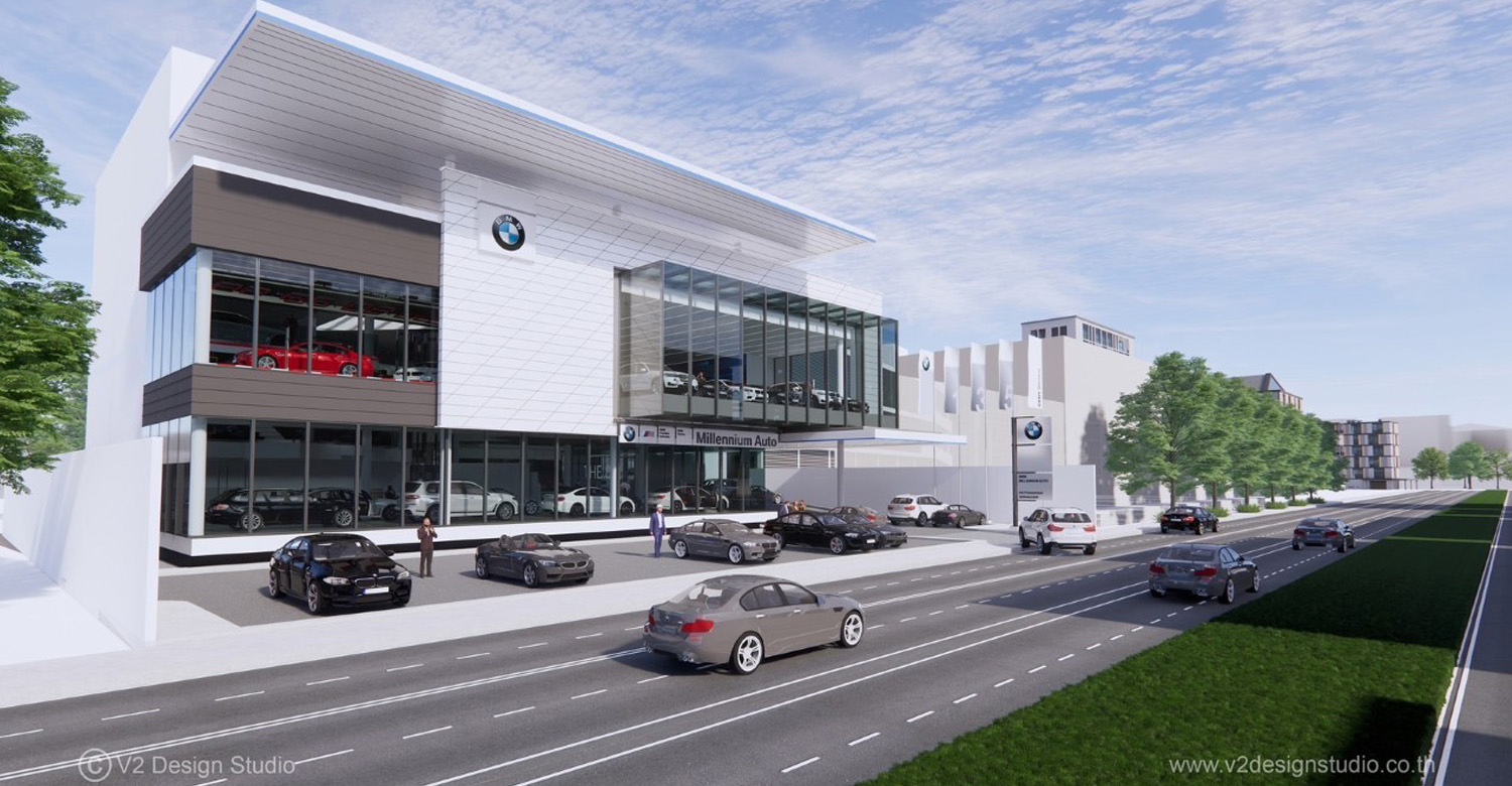 ของแฟลกชิปโชว์รูม บีเอ็มดับเบิลยู มิลเลนเนียม ออโต้ บนถนนพัฒนาการ-ศรีนครินทร์ที่เป็นเสมือนภาพสะท้อนที่ชัดเจนของไอเดียสร้างสรรค์สุดบรรเจิด