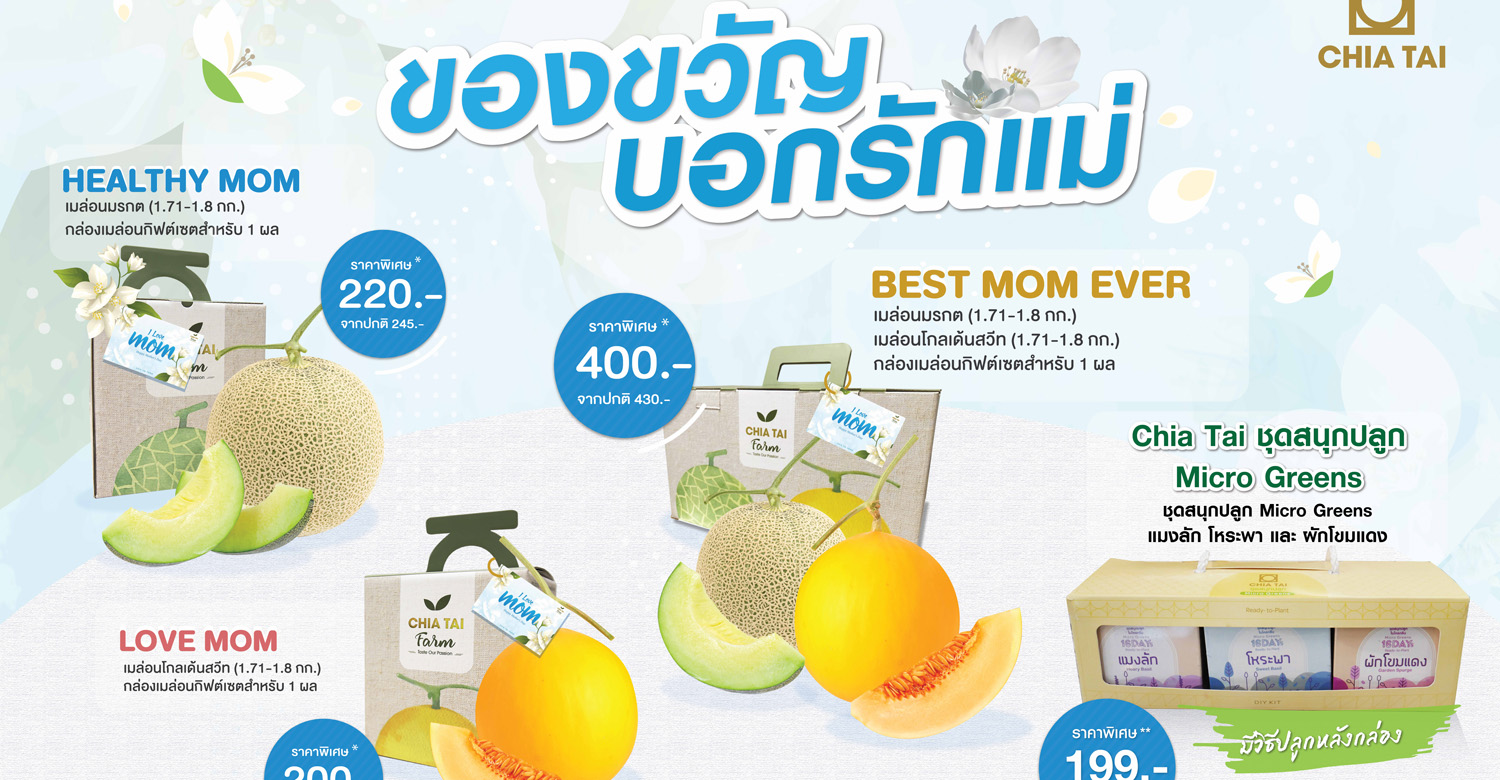 เริ่มตั้งแต่ชุดกิฟต์เซต เมล่อน ผลสดใหม่จากเจียไต๋ฟาร์ม ที่นอกจากรสชาติที่อร่อยและหอมหวานแล้ว ยังอุดมด้วยสารอาหารที่มีประโยชน์ต่อร่างกาย เพิ่มวิตามินและความสดชื่นให้คุณแม่ได้ด้วยตัวเลือก 3 ชุดของขวัญ ได้แก่ ชุด HEALTHY MOM ประกอบด้วย เมล่อนมรกต 1 ลูก พร้อมกล่องของขวัญ ราคาพิเศษ 220 บาท เอาใจคนที่ชอบเมล่อนเนื้อสีเขียว หอม หวานฉ่ำ หรือ ชุด LOVE MOM ที่มาพร้อมกับเมล่อนโกลเด้นสวีท 1 ลูก พร้อมกล่องของขวัญ ราคาพิเศษ 200 บาท สำหรับคนรักเมล่อนเนื้อสีส้มหวานกรอบ และ ชุด BEST MOM EVER จับคู่เมล่อนมรกต 1 ลูก และเมล่อนโกลเด้นสวีท 1 ลูก พร้อมกล่องของขวัญ ในราคาพิเศษ 400 บาท ซึ่งแต่ละชุดจะมาพร้อมการ์ดอวยพรสำหรับเขียนข้อความแทนใจส่งหาคุณแม่อีกด้วย ผู้ที่สนใจสามารถสั่งซื้อได้ที่ร้านเจียไต๋ฟาร์ม สุขุมวิท 60 หรือทาง Line @chiataifarm Facebook: Chia Tai Farm โทร 089-139-6170 ตั้งแต่วันนี้ถึง 15 สิงหาคม 2564