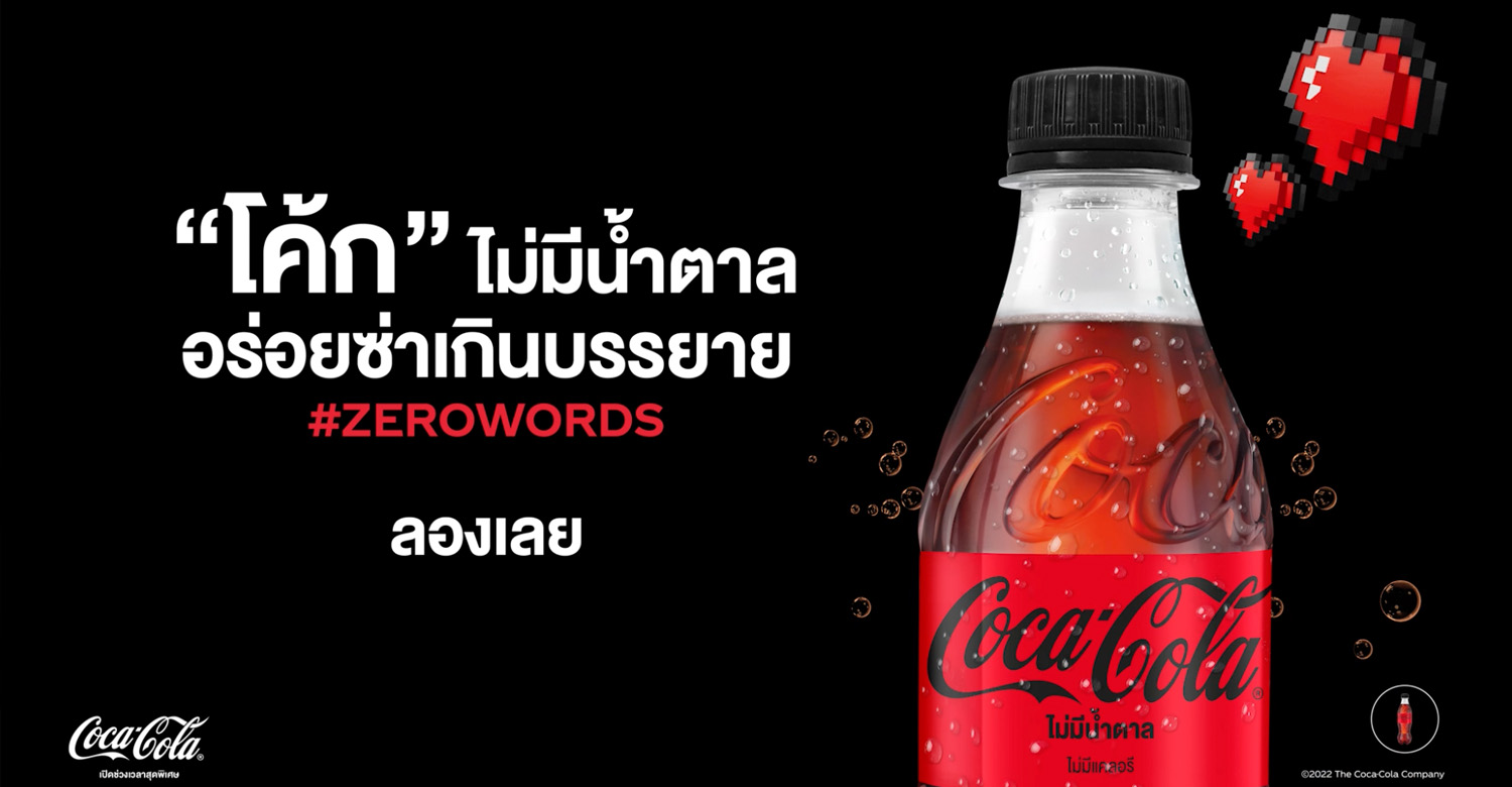 “โค้ก” ไม่มีน้ำตาล (Coca-Cola® Zero Sugar) เปิดตัวแคมเปญระดับโลก #ZeroWords ที่จะมาสร้างแรงบันดาลใจและเชิญชวนให้แฟนๆ “โค้ก” มาร่วมกันสื่อสารถึงความอร่อยซ่าของ “โค้ก” ไม่มีน้ำตาล ในรูปแบบต่างๆ บนแพลตฟอร์มสื่อโซเชียลมีเดีย ซึ่งโคคา-โคล่าได้บรรยายความอร่อยซ่าของผลิตภัณฑ์ผ่านอิโมจิต่างๆ ที่โดดเด่นไม่เหมือนใคร