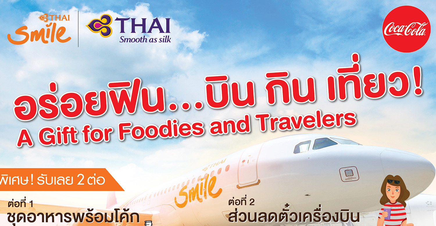 ต่อที่ 2: รับทันที! ส่วนลดบัตรโดยสารสายการบินไทยสมายล์ 10% สำหรับบัตรโดยสารประเภท Smile Value และ Smile Flexi และส่วนลด 15% สำหรับบัตรโดยสารประเภท Smile Plus จากราคาปกติ เพียงสั่งชุดอาหารคู่กับเครื่องดื่ม “โค้ก” มูลค่า 300 บาทต่อใบเสร็จ ณ ร้านค้าที่ร่วมรายการ รับโค้ดส่วนลดทันที สำหรับการจองบัตรโดยสารที่ www.thaismileair.com