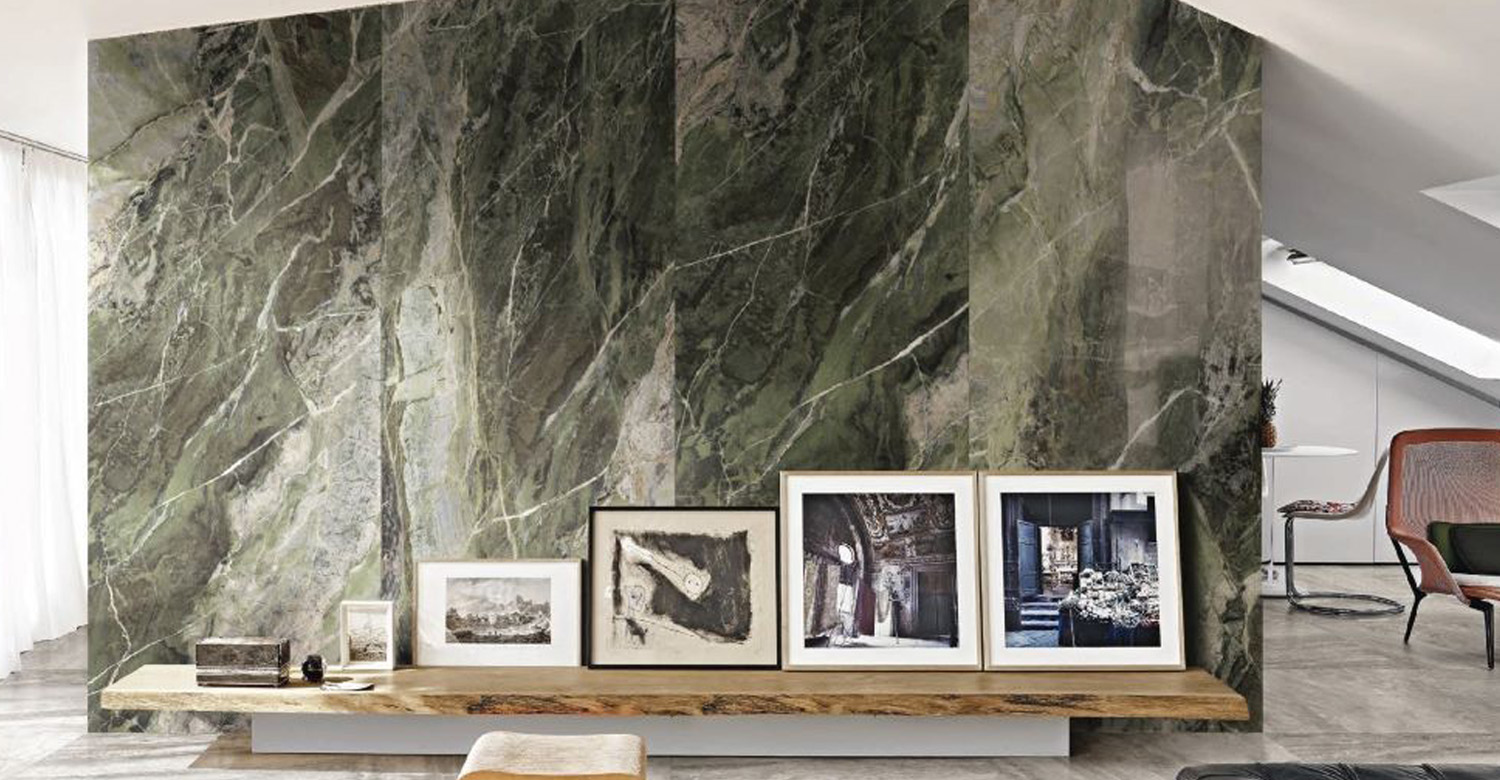 จากความงดงามของแลนด์สเคปที่ปกคลุมไปด้วยพื้นหญ้าตามเนินเขาลูกคลื่นของไอร์แลนด์ที่ได้นำมาถ่ายทอดผ่านงานดีไซน์ ลวดลายของสายแร่สีน้ำตาลและสีขาวรวมกันบนพื้นผิวดูเหมือนสีเขียวมรกต ที่ไล่เฉดสีตั้งแต่สีเข้มไปจนถึงถึงสีเขียวอ่อน พร้อมเพิ่มความหรูด้วยผิวหน้า Glossy ให้ดูวาววับ ขับพื้นที่ให้ดูงามสง่า แต่สดชื่นแบบไร้รอยต่อด้วยกระเบื้องพอร์ซเลน ขนาด 120×240 cm. ได้อย่างน่าอัศจรรย์