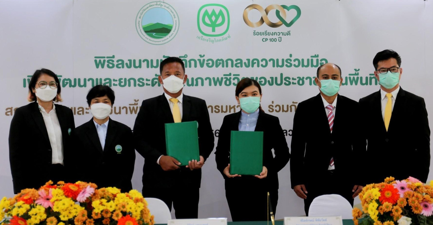สถาบันวิจัยและพัฒนาพื้นที่สูง (องค์การมหาชน) กำหนดจัดพิธีลงนามบันทึกข้อตกลงความร่วมมือ เพื่อพัฒนาและยกระดับคุณภาพชีวิตของประชาชนบนพื้นที่สูง ระหว่าง สถาบันวิจัยและพัฒนาพื้นที่สูง (องค์การมหาชน) นำโดย นายวิรัตน์ ปราบทุกข์ ผู้อำนวยการสถาบันวิจัยและพัฒนาพื้นที่สูง และฝ่ายพัฒนาความยั่งยืนภาครัฐ เครือเจริญโภคภัณฑ์ นำโดย นางสาวพิไลลักษณ์ พิชัยวัตต์ ผู้ช่วยกรรมการผู้จัดการ ด้านปฏิบัติการความยั่งยืนและกิจการเพื่อสังคม เครือเจริญโภคภัณฑ์ โดยได้รับเกียรติจาก นายชวลิต ชูขจร กรรมการผู้ทรงคุณวุฒิด้านการเกษตร และประธานอนุกรรมการวิจัยและพัฒนา สถาบันวิจัยและพัฒนาพื้นที่สูง กล่าวแสดงความยินดี ในพิธีลงนามบันทึกข้อตกลงความร่วมมือเพื่อพัฒนาและยกระดับคุณภาพชีวิตของประชาชนบนพื้นที่สูง พร้อมด้วย ดร.เพชรดา อยู่สุข รองผู้อำนวยการสถาบันวิจัยและพัฒนาพื้นที่สูง ด้านการพัฒนา นางอาณดา นิรันตรายกุล ผู้อำนวยการอุทยานหลวงราชพฤกษ์ นายอรรถวิทย์ ยุทธยศ ผู้จัดการทั่วไป ด้านปฏิบัติการความยั่งยืน และนายกฤตยรัฐ ปารมี ผู้จัดการมูลนิธิเจริญโภคภัณฑ์พัฒนาชีวิตชนบท ร่วมเป็นสักขีพยาน