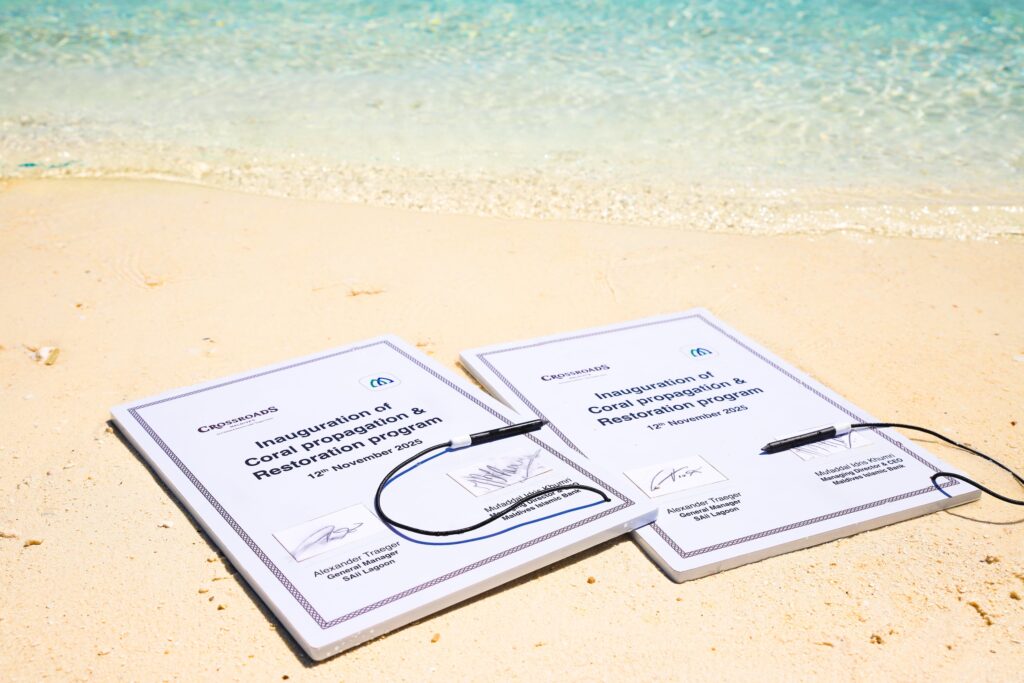 พิธีลงนามบันทึกข้อตกลงครั้งนี้ ร่วมลงนามโดย Mr. Mufaddal Idris Khumri กรรมการผู้จัดการธนาคารอิสลามแห่งมัลดีฟส์ และ มร. อเล็กซานเดอร์ เทรเกอร์ ผู้จัดการทั่วไปของทราย ลากูน มัลดีฟส์ และ เดอะ มารีน่า แอท ครอสโร้ดส์ โดยพิธีการจัดขึ้นใต้ท้องทะเลภายในลากูนอันเป็นพื้นที่จริงที่จะดำเนินงานฟื้นฟูแนวปะการัง ทั้งนี้ ผู้บริหารทั้งสองท่านยังเป็นนักดำน้ำตัวยงและได้เข้าร่วมพิธีลงนามเชิงสัญลักษณ์ใต้ผิวน้ำด้วยตนเอง