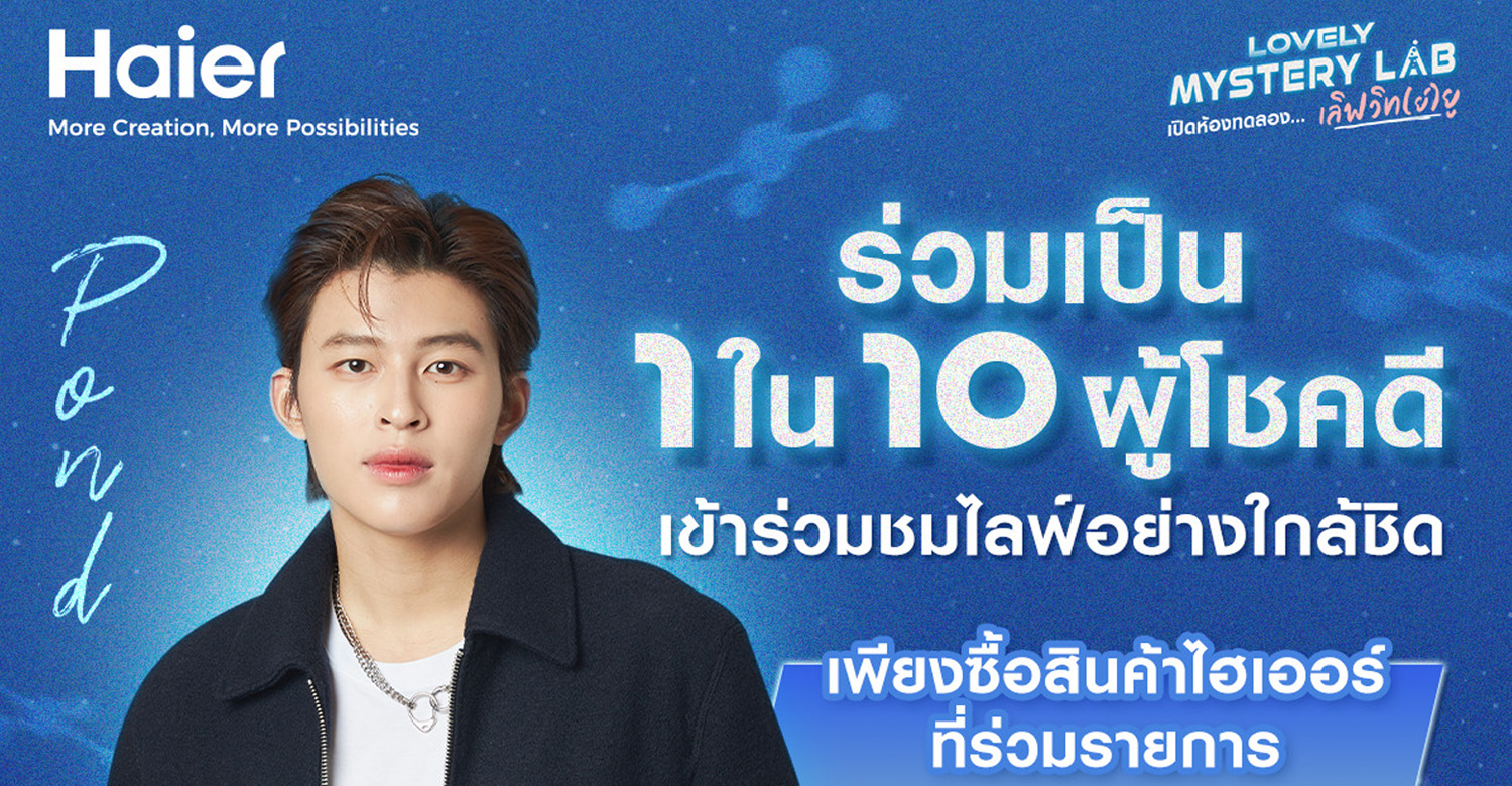 ครึ่งปีแห่งความปัง! เรียกได้ว่างานฮอตงานรุมไม่พัก สูสีตีคู่กับหน้าตาจริง ๆ สำหรับหนุ่มหล่อ “ปอนด์ ณราวิชญ์ เลิศรัตน์โกสุมภ์” ที่เตรียมเล่นใหญ่เนรมิตห้องแล็ปทดลองแสนพิเศษ พร้อมมอบความสุขให้แฟน ๆ สนุกสุดฟินแบบเกินร้อย ในกิจกรรม Haier Dream For Fan SS4 ตอน “Haier x Pond Lovely Mystery Lab เปิดห้องทดลอง…เลิฟ(วิทย์)ยู” เตรียมสร้างหลักสูตรรักแบบเร่งรัดให้เหล่าแฟน ๆ ทั้งในจอและนอกจอหัวใจฟูกันถ้วนหน้า ผ่านกิจกรรมการทดลองแสนสนุกไปกับ Pondfessor มาดเท่ ทางไลฟ์บน Facebook : Haier Thailand ในวันที่ 4 ตุลาคม 2567 เวลา 18.00 น. พร้อมลุ้นเป็น 1 ใน 10 ผู้โชคดีเข้าร่วมห้องแล็ป เพื่อเข้าร่วมชมไลฟ์ในพื้นที่ Live Area สุดเอ็กซ์คลูซีฟอีกด้วย เพียงซื้อสินค้าไฮเออร์ที่ร่วมรายการ ตั้งแต่วันนี้ – 25 กันยายน 2567 สามารถติดตามรายละเอียดกติกาการร่วมสนุกของกิจกรรมเพิ่มเติม ได้ที่ Facebook Haier Thailand: https://www.facebook.com/HaierThailand