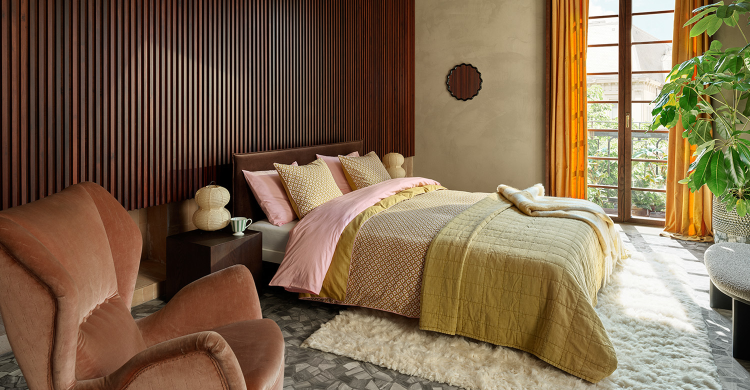 นอกจากนี้ยังมีของใช้สำหรับห้องนอนและห้องน้ำอีกด้วย มาพร้อมกับกลิ่นอายความเป็นสากลผสมผสานดีไซน์ที่แปลกตา ไม่ว่าจะเป็นเครื่องนอนสีชมพูและสีเขียว ตกแต่งด้วยลายหกเหลี่ยมที่ทำให้ห้องนอนดูเรียบหรูแบบโมเดิร์น และยังมีพรมที่หนานุ่มและมีผิวสัมผัสต่าง ๆ ออกแบบมาเพื่อสร้างความสมดุลระหว่างความสบายและความสวยงาม มีทั้งผ้าวูลสีขาว ผ้าฝ้ายขนปุยสีน้ำตาล หรือแบบมีลวดลายเรขาคณิตสีแดง สีเบอร์กันดี สีขาว และสีเขียวมิ้นต์ เปลี่ยนโฉมห้องน้ำของคุณให้หรูหราและผ่อนคลายด้วยผ้าเช็ดตัวและพรมเช็ดเท้าดีไซน์ใหม่ ขอบหยักแบบสแกลล็อป มีให้เลือกหลากสี ไม่ว่าจะเป็นสีเหลืองมัสตาร์ด สีชมพู หรือสีขาวครีม ปิดท้ายด้วยผ้าม่านอาบน้ำ ขวดใส่สบู่หัวปั๊ม และแก้วใส่แปรงสีฟัน ทำจากแผ่นอะคริลิกใสสีเหลือง เพิ่มความเก๋และโมเดิร์นให้กับชีวิตประจำวันของคุณ