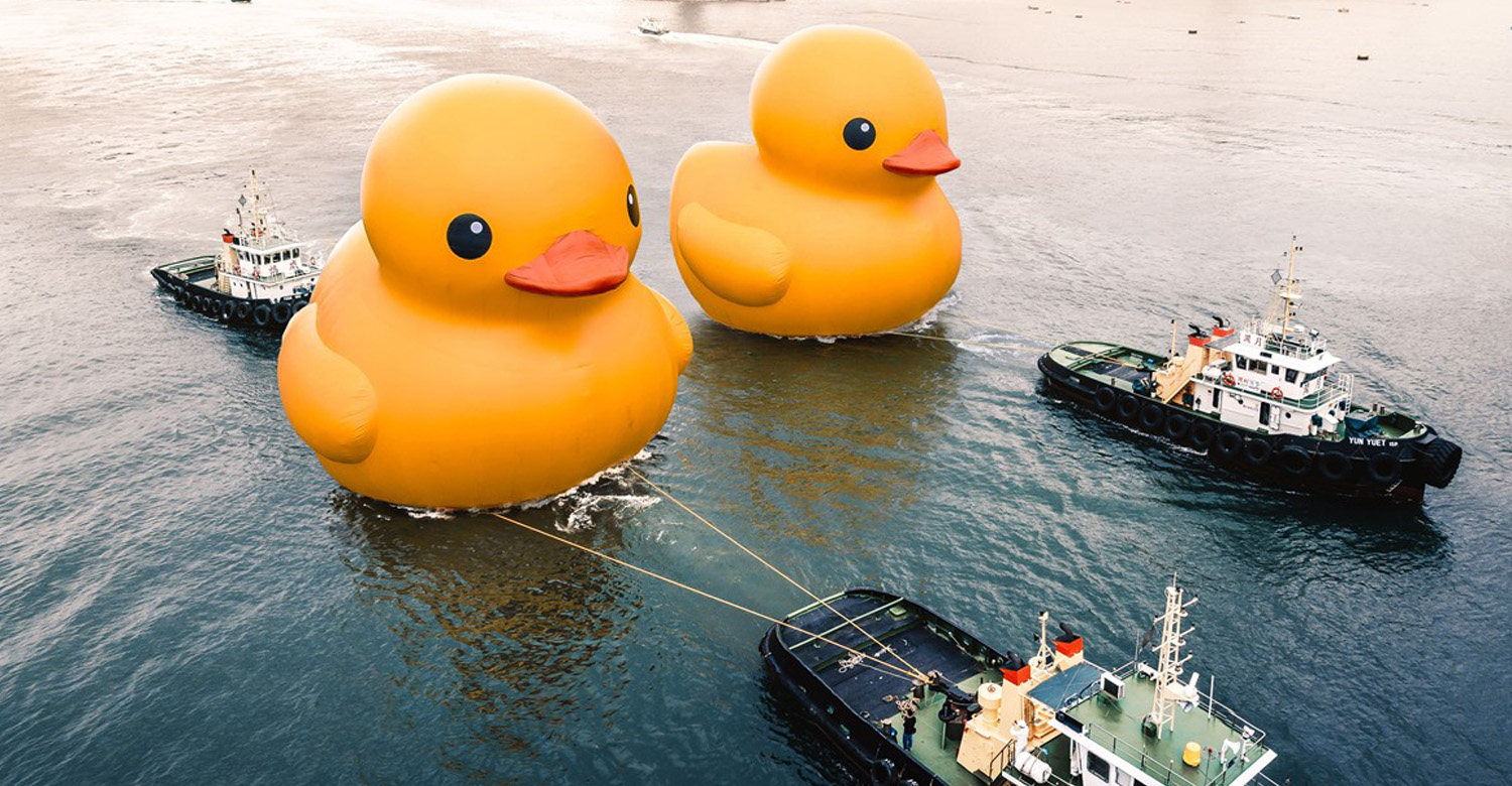 ฤดูร้อนเวียนมาถึงพร้อมงานอีเวนท์หลากหลายในฮ่องกง และสำหรับปีนี้ก็เปิดประเดิมฤดูกาลได้อย่างสะกดสายตาที่สุด ย้อนกลับไปเมื่อปี 2556 อ่าววิคตอเรียเคยเป็นที่สถิตของ Rubber Duck ประติมากรรมเป่าลมขนาดยักษ์ฝีมือศิลปินชาวดัตช์ Florentijn Hofman ที่ทาง AllRightsReserved ครีเอทีฟสตูดิโอของฮ่องกงนำมาจัดแสดง จนเป็นที่รู้จักอย่างกว้างขวางและได้กลายเป็นสัญลักษณ์แห่งความสนุกในช่วงฤดูร้อนของฮ่องกงไปโดยปริยาย และในปีนี้ AllRightsReserved ก็ได้พาเจ้าเป็ดยักษ์สูง 18 เมตร กลับมาแวะเยี่ยมเกาะนี้อีกครั้งพร้อมแฝดเพื่อนอีกหนึ่งตัว กับการจัดแสดง DOUBLE DUCKS โดย Florentijn Hofmanเป็นเวลา 2 สัปดาห์เต็ม ซึ่งเราจะได้พบกับเป็ดยักษ์สองตัวที่ลอยเด่นอย่างภาคภูมิในอ่าววิคตอเรียตั้งแต่วันที่ 10 ไปจนถึง 23 มิถุนายนนี้