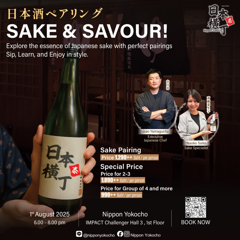 นอกจากนี้ ร้านอาหารญี่ปุ่น “นิปปอน โยโคโจว” ร้านอาหารสไตล์กินดื่มที่มาพร้อมความสนุกสนานในคอนเซปต์ “โยโคโจว” ยกตรอกซอยที่ญี่ปุ่น มารวมไว้ในที่เดียว ตั้งอยู่บริเวณ ชั้น 1 ฟู้ดเอเทรี่ยม อาคารชาเลนเจอร์ 3 อิมแพ็ค เมืองทองธานี ได้จัดงาน “Sake & Savour: Sake Pairing Event” ค่ำคืนพิเศษสำหรับผู้ที่ชื่นชอบเครื่องดื่มญี่ปุ่นต้นตำรับและศิลปะเเห่งการจับคู่รสชาติ โดยภายในงานจะมีการนำเสนอเครื่องดื่มญี่ปุ่นคุณภาพกว่า 9 ชนิดจากหลากหลายแคว้นเเห่งเเดนอาทิตย์อุทัย อาทิ Dassai 45, Tatenokawa Karakuchi, Yukinobosha Yamahai, Koimari Junmai Ginjo, Iyo Kagiya Muroka และ Bijofu Honjozo ควบคู่กับอาหารญี่ปุ่น 5 คอร์สคุณภาพที่รังสรรค์อย่างพิถีพิถัน จากเชฟอิซาโอะ ยามะกูจิ (Isao Yamaguchi)เชฟญี่ปุ่นมากประสบการณ์กว่า20ปี โดยมี คุณนาโอโกะ ไซโตะ (Naoko Saito) ผู้เชี่ยวชาญด้านเครื่องดื่มญี่ปุ่นระดับพรีเมียม เป็นผู้นำเสนอความรู้และเทคนิคการจับคู่เพื่อความเอร็ดอร่อยในระหว่างการรับประทาน