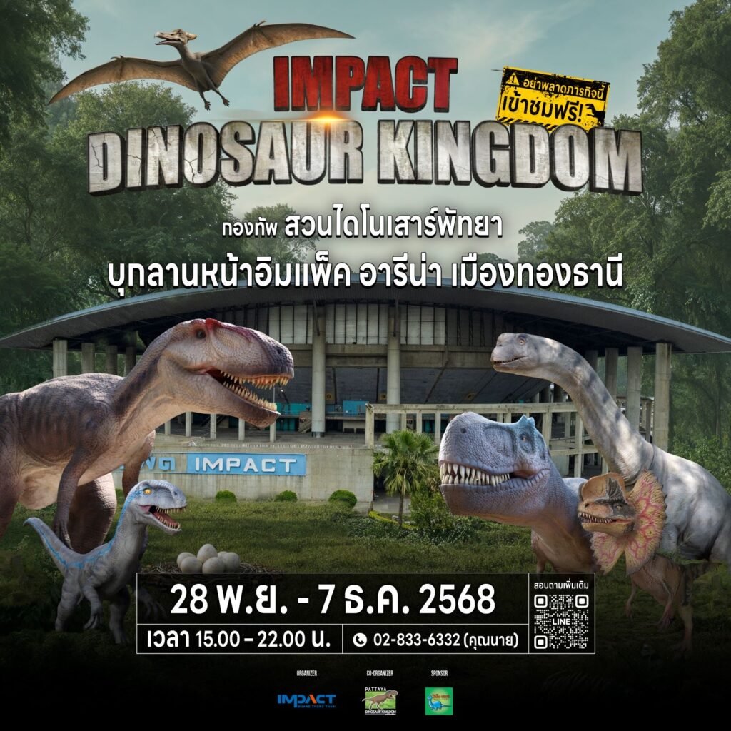 ได้แก่ อัลโลซอรัส, ทีเร็กซ์, คามาราซอรัส, แร๊พเตอร์, พาราซอโรโลฟัส, สยามโมซอรัส สุธีธรนี, ไดโลโฟซอรัส และสเตโกซอรัส ต่อด้วยโซนถ่ายภาพสุดปัง เวิร์คช้อปตามหาโครงกระดูกไดโนเสาร์ และมุมระบายสีน้องไดโนเสาร์ งานนี้เข้าฟรี ตั้งแต่วันที่ 28 พ.ย.-7 ธ.ค.2568 ณ ลานหน้าอิมแพ็ค อารีน่า เมืองทองธานี