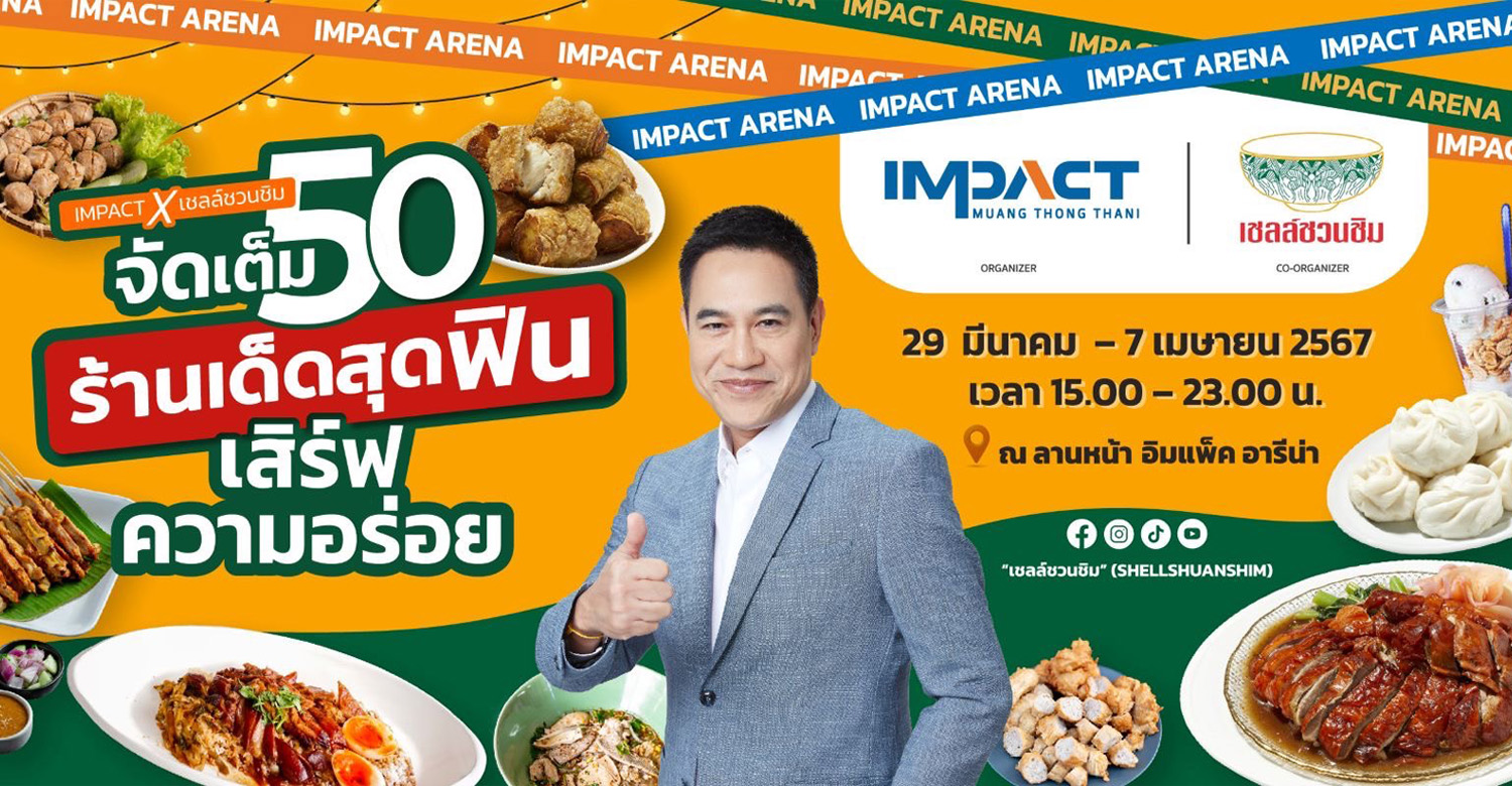 อิมแพ็ค เมืองทองธานี ผนึก เชลล์ชวนชิม สัญลักษณ์แห่งความอร่อยที่เข้าใจรสชาติของคนไทยอย่างยาวนานกว่า 62 ปี เปิดบิ๊กอีเวนต์ “อิมแพ็ค x เชลล์ชวนชิม” จัดเต็ม 50 ร้านเด็ดสุดฟิน เสิร์ฟความอร่อยถึง 10 วัน รวมสตรีทฟู้ดร้านดังทั่วประเทศ ตั้งแต่วันที่ 29 มี.ค.-7 เม.ย.67 ณ ลานหน้า อิมแพ็ค อารีน่า เมืองทองธานี คาดมีผู้เข้าร่วมงานกว่า 100,000 คน