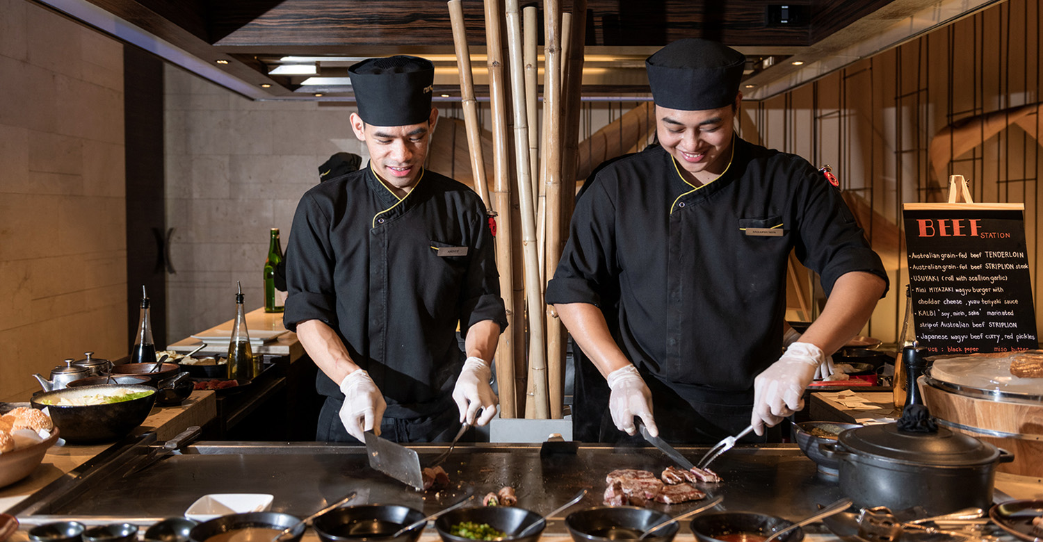 เริ่มเส้นทางความอร่อยแรกที่ห้องอาหารญี่ปุ่น สึ จัดเสิร์ฟซาชิมิยอดนิยม อาทิ ปลาฮามาจิ แซลมอน ทูน่า หอยเชลล์ญี่ปุ่น (โฮตาเตะ) และไข่ปลาแซลมอน (อิคุระ) หอยนางรมอวบสดใหม่หลายสายพันธุ์ทั้งฟิน เดอ แคลร์ ไอริช และนอร์มังดี ส่วนสเตชันซูชิขนขบวนซูชิโรลไส้แน่น อาทิ แคลิฟอร์เนียโรล สไปซีแซลมอนโรล และซูชิโรลไส้ผัก หรือจะเป็นซูชิปลาทูน่า ซูชิปลาฮามาจิ ซูชิแซลมอน ซูชิเต้าหู้หวาน (อินาริซูชิ) ก็มีให้คุณได้เลือกสรรเช่นกัน ในส่วนของอาหารเรียกน้ำย่อย พร้อมเสิร์ฟสลัดแตงกวากุ้ง สลัดซอสงาขาวหรือซอสงาซีอิ๊วญี่ปุ่น ไข่ตุ๋นญี่ปุ่น ซุปเห็ดชิตาเกะ และซุปมิโซะสาหร่ายวากาเมะและเต้าหู้