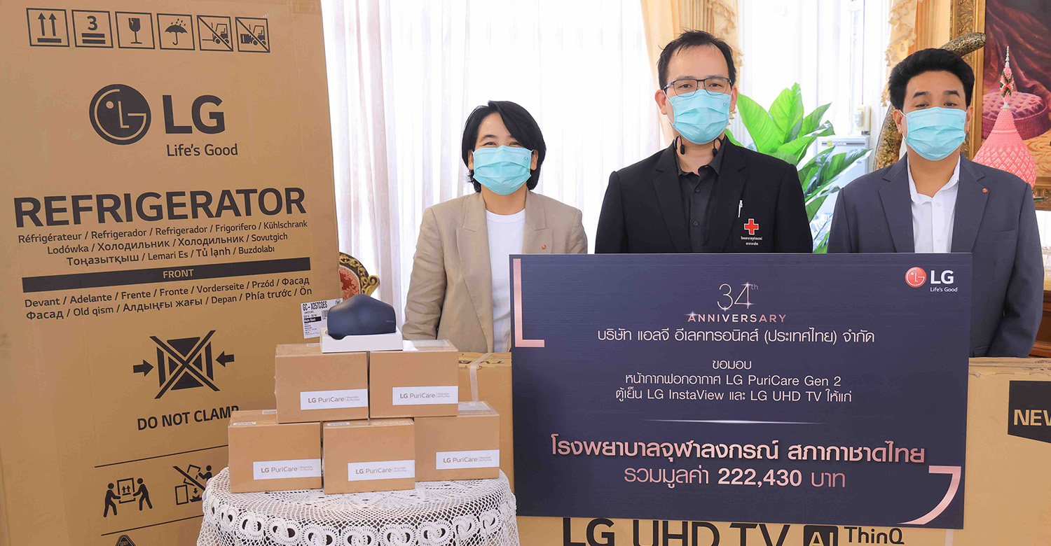ประกอบด้วยหน้ากากฟอกอากาศ LG PuriCareTM Gen 2 จำนวน 16 เครื่อง ตู้เย็น LG InstaView Door-in-DoorTM รุ่นล่าสุด 1 เครื่อง และทีวี LG UHD 4K Smart TV รุ่น 65UN7200 ขนาด 65 นิ้ว 1 เครื่อง รวมมูลค่า 222,430 บาท ให้แก่โรงพยาบาลจุฬาลงกรณ์ สภากาชาดไทย พร้อมหน้ากากฟอกอากาศ LG PuriCareTM Gen 2 จำนวน 16 เครื่อง ทีวี LG UHD 4K Smart TV รุ่น 75UN7200 ขนาด 75 นิ้ว 1 เครื่อง และทีวี LG UHD 4K Smart TV รุ่น 70UN7300 ขนาด 70 นิ้ว 1 เครื่อง รวมมูลค่า 196,120 บาท แก่มูลนิธิแพทย์อาสาสมเด็จพระศรีนครินทราบรมราชชนนี (มูลนิธิ พอ.สว.) เพื่อสนับสนุนการทำงานของบุคลากรทางการแพทย์ที่ให้การดูแลทางการแพทย์ และสาธารณสุขแก่ประชาชนอย่างทุ่มเท พร้อมเพิ่มประสิทธิภาพการดำเนินงานให้คล่องตัวยิ่งขึ้น ด้วยนวัตกรรมเครื่องใช้ไฟฟ้าที่มีคุณภาพจากแอลจี